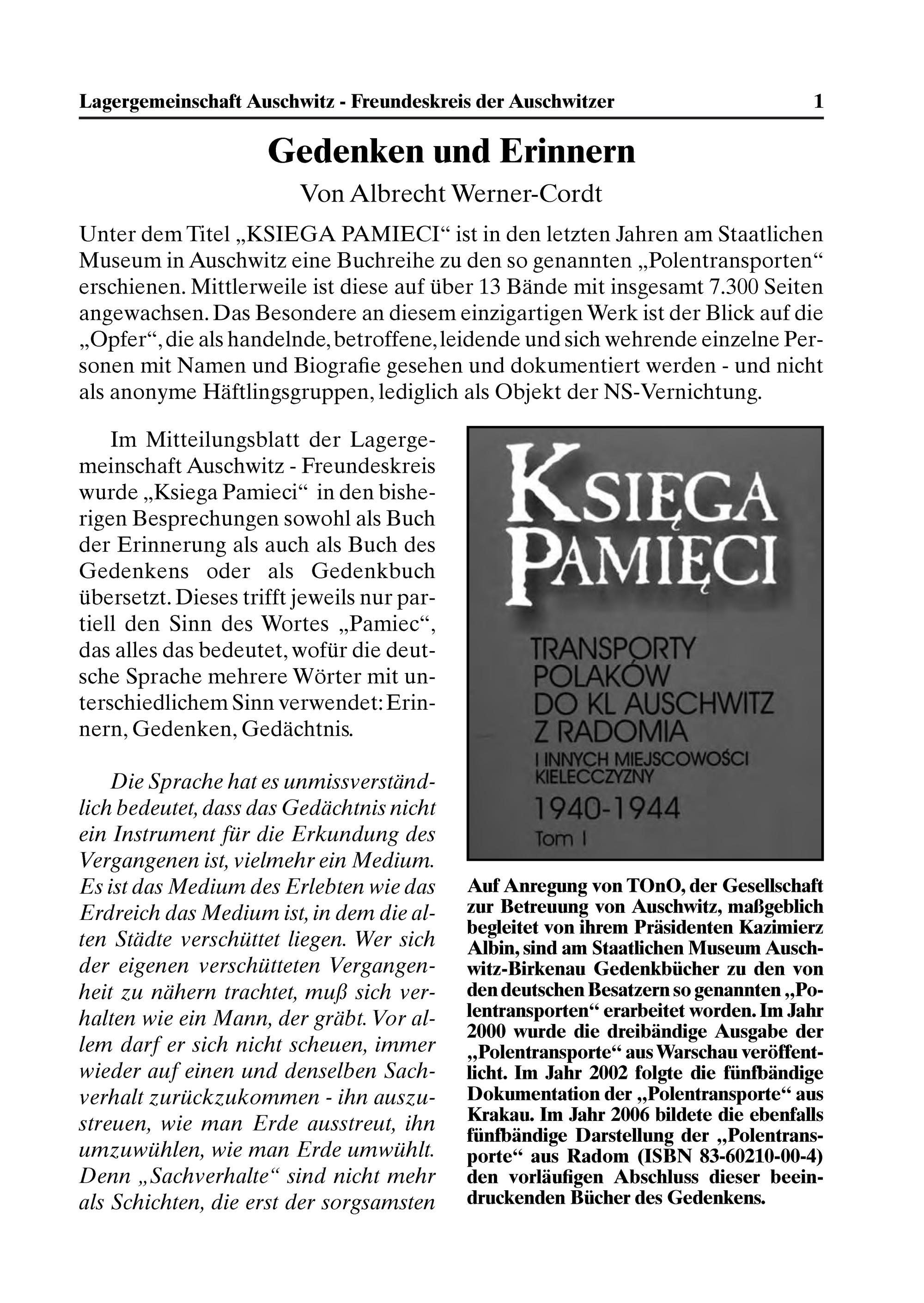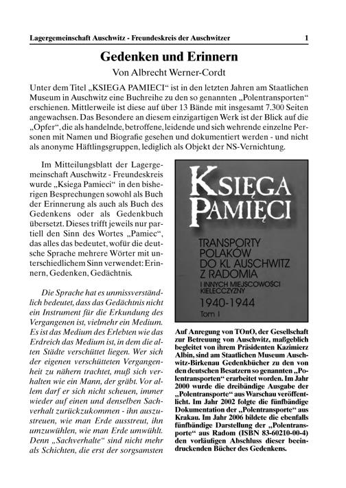 Unter dem Titel„KSIEGA PAMIECI“ ist in den letzten Jahren am Staatlichen Museum in Auschwitz eine Buchreihe zu den so genannten„Polentransporten“ erschienen. Mittlerweile ist diese auf über 13 Bände mit insgesamt 7.300 Seiten angewachsen. Das Besondere an diesem einzigartigen Werk ist der Blick auf die „Opfer“, die als handelnde, betroffene, leidende und sich wehrende einzelne Per- Sonen mit Namen und Biografie gesehen und dokumentiert werden- und nicht als anonyme Häftlingsgruppen, lediglich als Objekt der NS-Vernichtung.