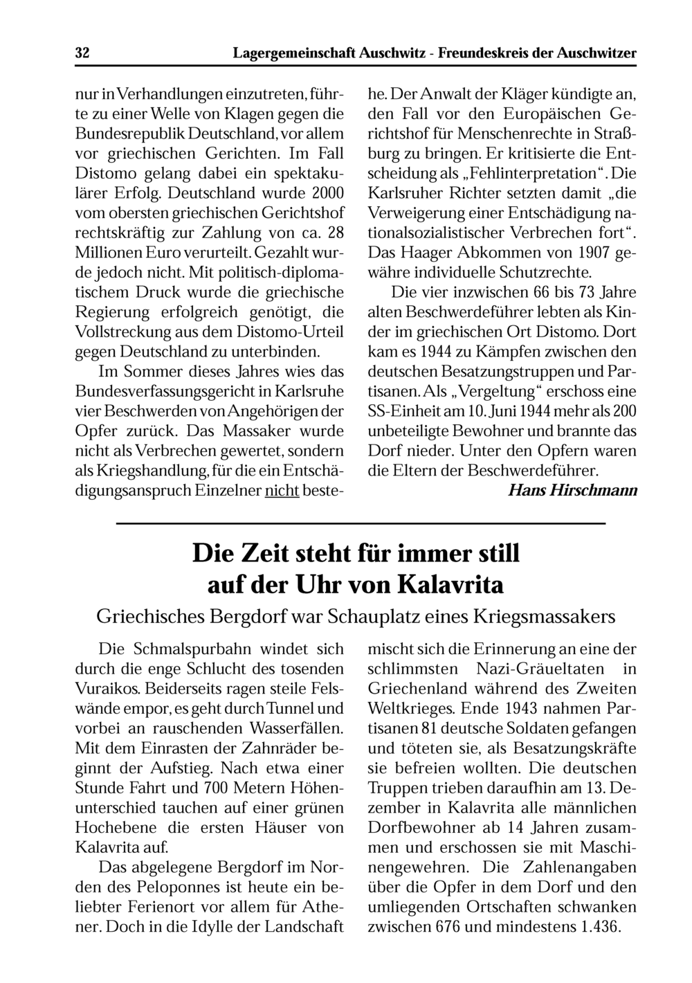 mischt sich die Erinnerung an eine der schlimmsten Nazi-Gräueltaten in Griechenland während des Zweiten Weltkrieges. Ende 1943 nahmen Par- tisanen 81 deutsche Soldaten gefangen und tõteten sie, als Besatzungskräfte sie befreien wollten. Die deutschen Truppen trieben daraufhin am 13. De⸗ zember in Kalavrita alle männlichen Dorfbewohner ab 14 Jahren zusam- men und erschossen sie mit Maschi- nengewehren. Die Zahlenangaben über die Opfer in dem Porf und den umliegenden Ortschaften schwanken zwischen 676 und mindestens 1.436.
