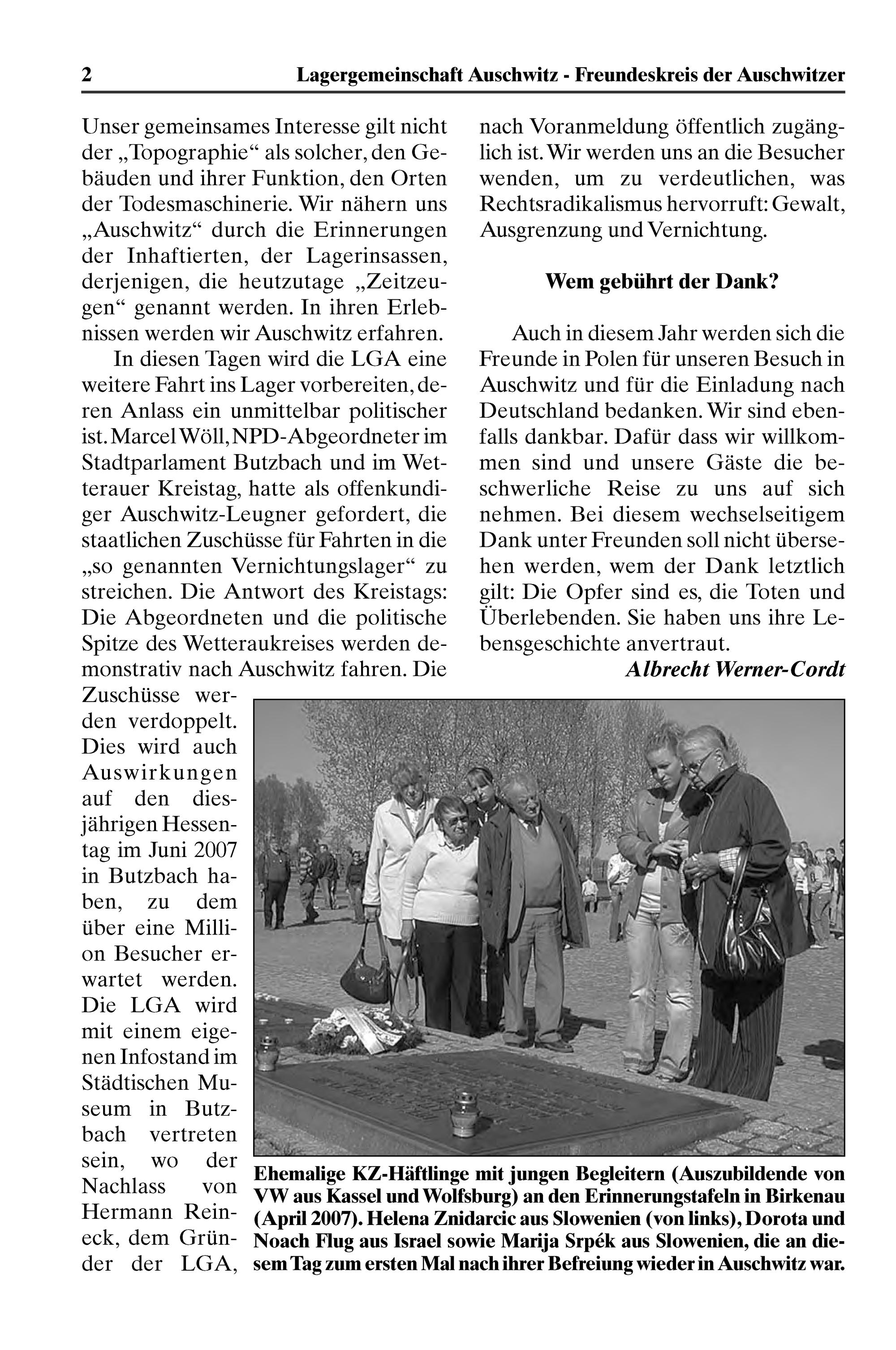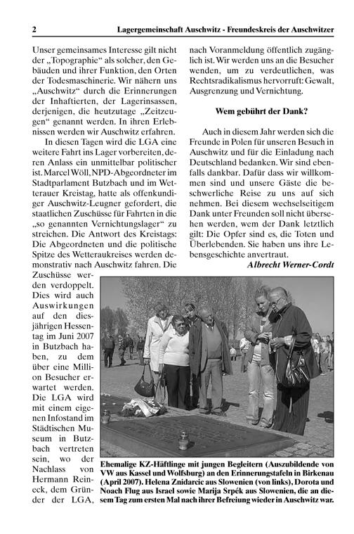 In diesen Tagen wird die KGM eine weitere Fahrt ins Lager vorbereiten, de- ren Anlass ein unmittelbar politischer ist. Marcel Wöll, NPD-Abgeordneter im Stadtparlament Butzbach und im Wet- terauer Kreistag, hatte als offenkundi- ger Auschwit?-Leugner gefordert, die Staatlichen Zuschüsse für Fahrten in die „SO genannten Vernichtungslager“ zu Streichen. Die Antwort des Kreistags: Die Abgeordneten und die politische Spitꝰe des Wetteraukreises werden de- monstrativ nach Auschwit? fahren. Die Zuschüsse wer- den verdoppelt. Dies wird auch Auswirkungen auf den dies— jährigen Hessen- tag im Juni 2007 in But?zbach ha- ben, zu dem über eine Milli- on Besucher er— wartet werden. Die LGA wird mit einem eige-— nen Infostand im Städtischen Mu— seum in But?— bach vertreten sein, wo der Nachlass von Hermann Rein- eck, dem Grün- der der LGA,