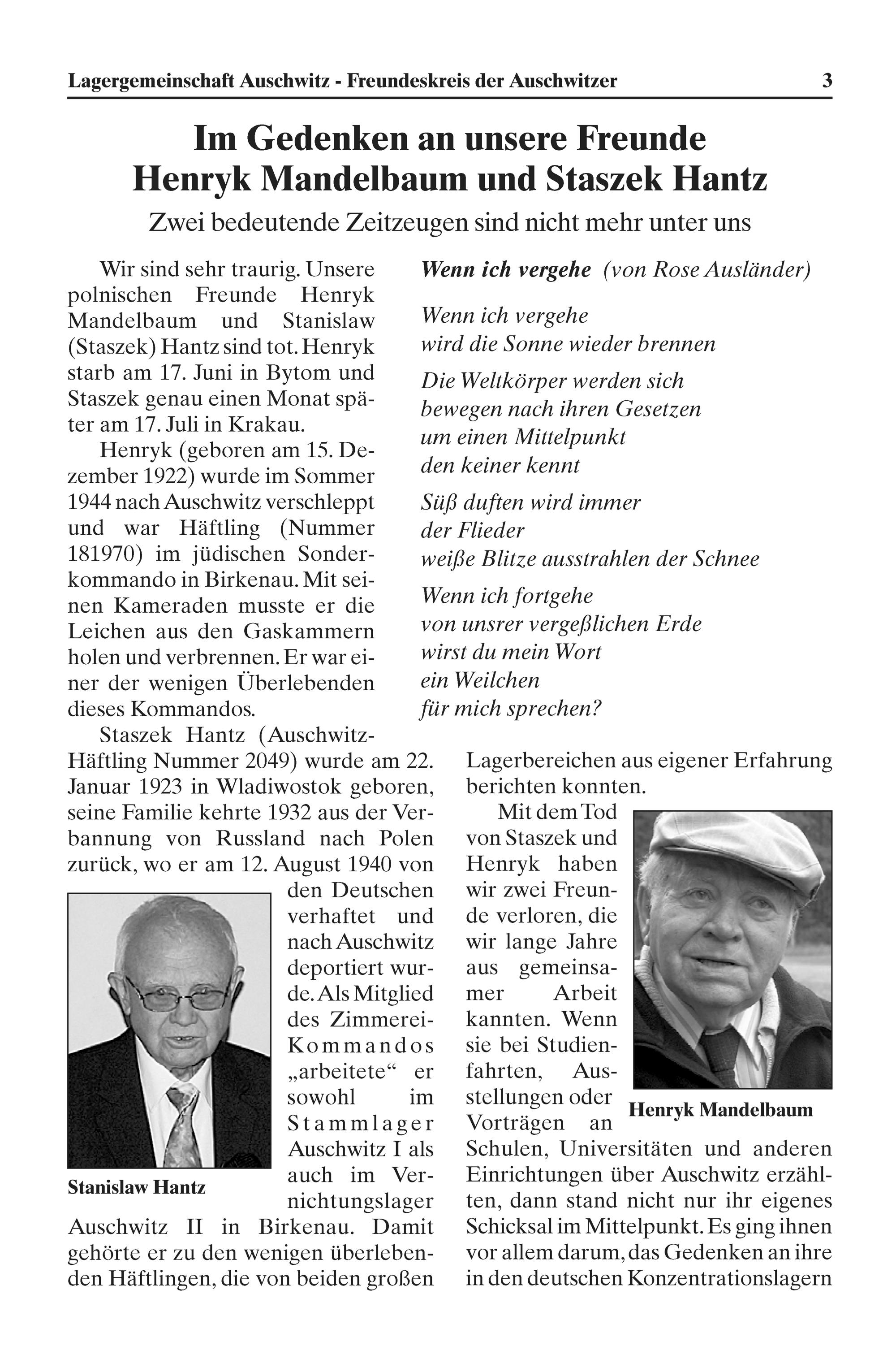Wir sind sehr traurig. Unsere polnischen Freunde Henryk Mandelbaum und Stanislaw (Stas?ek) Hant? sind tot. Henryk starb am 17. Juni in Bytom und Stas?ek genau einen Monat spã- ter am 17. Juli in Krakau.