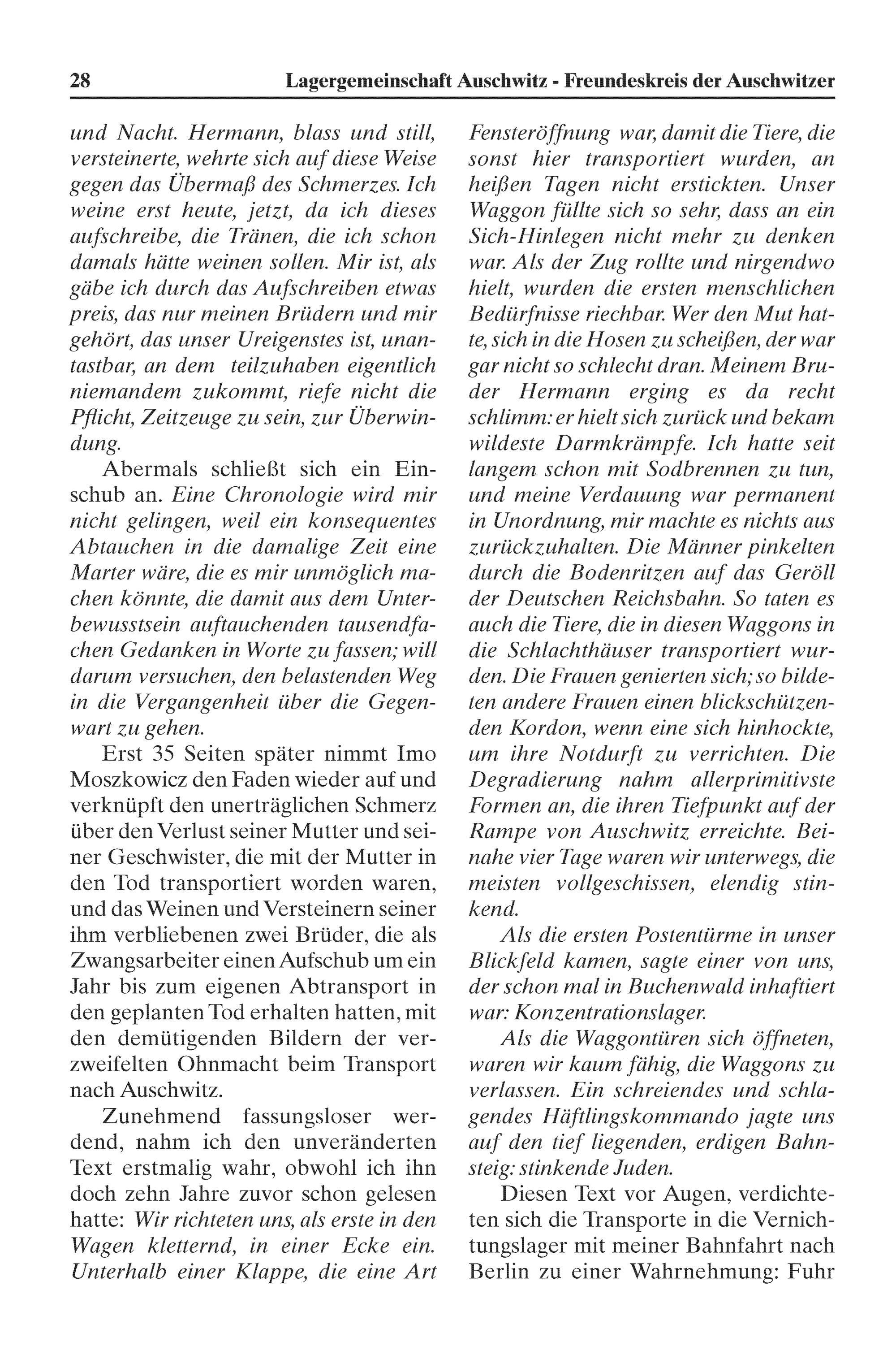 Prst 35 Seiten später nimmt Imo Mos?kowicz den Faden wieder auf und verknüpft den unertrãglichen Schmer? über den Verlust seiner Mutter und sei- ner Geschwister, die mit der Mutter in den Tod transportiert worden waren, und das Weinen und Versteinern seiner ihm verbliebenen zwei Brüder, die als Zwangsarbeiter einen Aufschub um ein Jahr bis Zzum eigenen Abtransport in den geplanten Tod erhalten hatten, mit den demütigenden Bildern der ver- zweifelten Ohnmacht beim Transport nach Auschwitz.