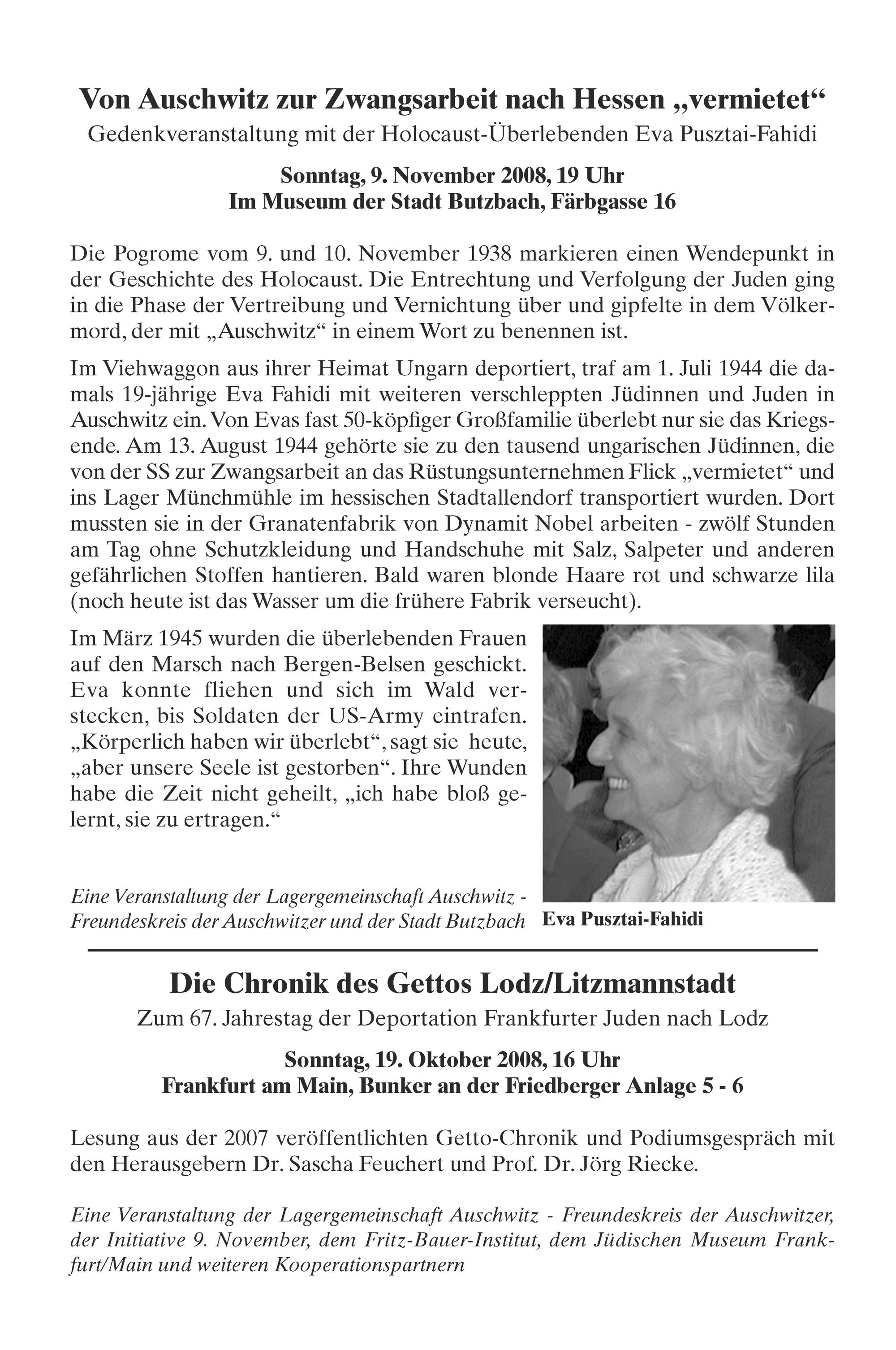Von Auschwitz zur Zwangsarbeit nach Hessen„vermietet“ Gedenkveranstaltung mit der Holocaust-Uberlebenden Eva Pusztai-Fahidi