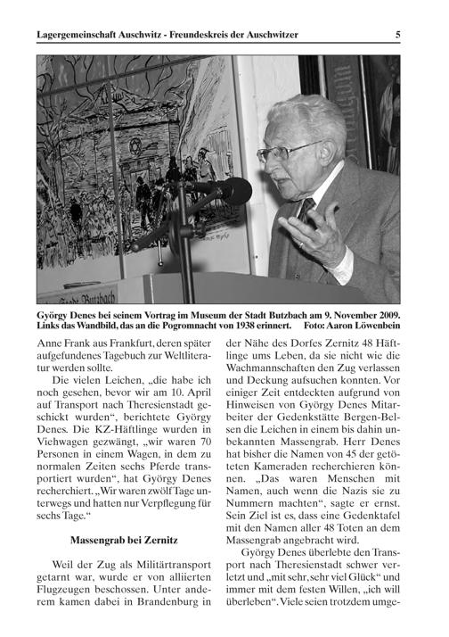 der Nähe des Dorfes Zernitz 48 Häft- linge ums Leben, da sie nicht wie die Wachmannschaften den Zug verlassen und Deckung aufsuchen konnten. Vor einiger Zeit entdeckten aufgrund von Hinweisen von György Denes Mitar- beiter der Gedenkstätte Bergen-Bel- Sen die Leichen in einem bis dahin un— bekannten Massengrab. Herr Denes hat bisher die Namen von 45 der getö- teten Kameraden recherchieren kön- nen.„Das waren Menschen mit Namen, auch wenn die Nazis sie zu Nummern machten“, sagte er ernst. Sein Ziel ist es, dass eine Gedenktafel mit den Namen aller 48 Toten an dem Massengrab angebracht wird.