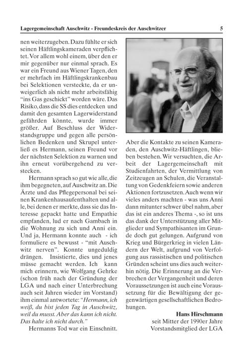 beit der Lagergemeinschaft mit Studienfahrten, der Vermittlung von Zeitzeugen an Schulen, die Veranstal- tung von Gedenkfeiern sowie anderen Aktionen fortzusetzen. Auch wenn wir vieles anders machten- was uns Anni dann mitunter schwer übel nahm, aber das ist ein anderes Thema-, so ist uns das dank der Unterstüt?ung aller Mit- glieder und Sympathisanten im Grun- de doch gut gelungen. Aufgrund von Krieg und Bürgerkrieg in vielen Län- dern der Welt, aufgrund von Verfol- gung aus rassistischen und politischen Gründen scheint uns dies auch weiter- hin nötig. Die Brinnerung an die Ver- brechen der Vergangenheit und deren Voraussetzungen ist auch eine Voraus- set?ung für die Bewältigung der ge- genwärtigen gesellschaftlichen Bedro- hungen. Hans Hirschmann Seit Mitter der 1990er Jahre Vorstandsmitglied der KGA
