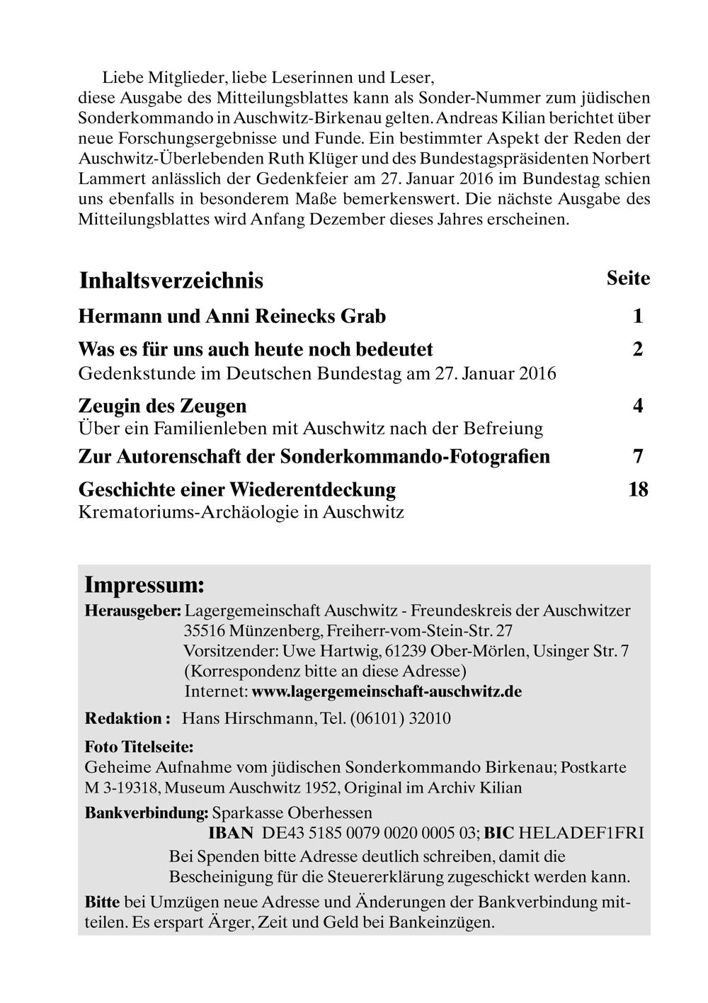diese Ausgabe des Mitteilungsblattes kann als Sonder-Nummer zum jüdischen Sonderkommando in Auschwitz-Birkenau gelten. Andreas Kilian berichtet über neue Forschungsergebnisse und Funde. Ein bestimmter Aspekt der Reden der Auschwitz-Uberlebenden Ruth Klüger und des Bundestagspräsidenten Norbert Lammert anlässlich der Gedenkfeier am 27. Januar 2016 im Bundestag schien uns ebenfalls in besonderem Maße bemerkenswert. Die nächste Ausgabe des Mitteilungsblattes wird Anfang Dezember dieses Jahres erscheinen.
