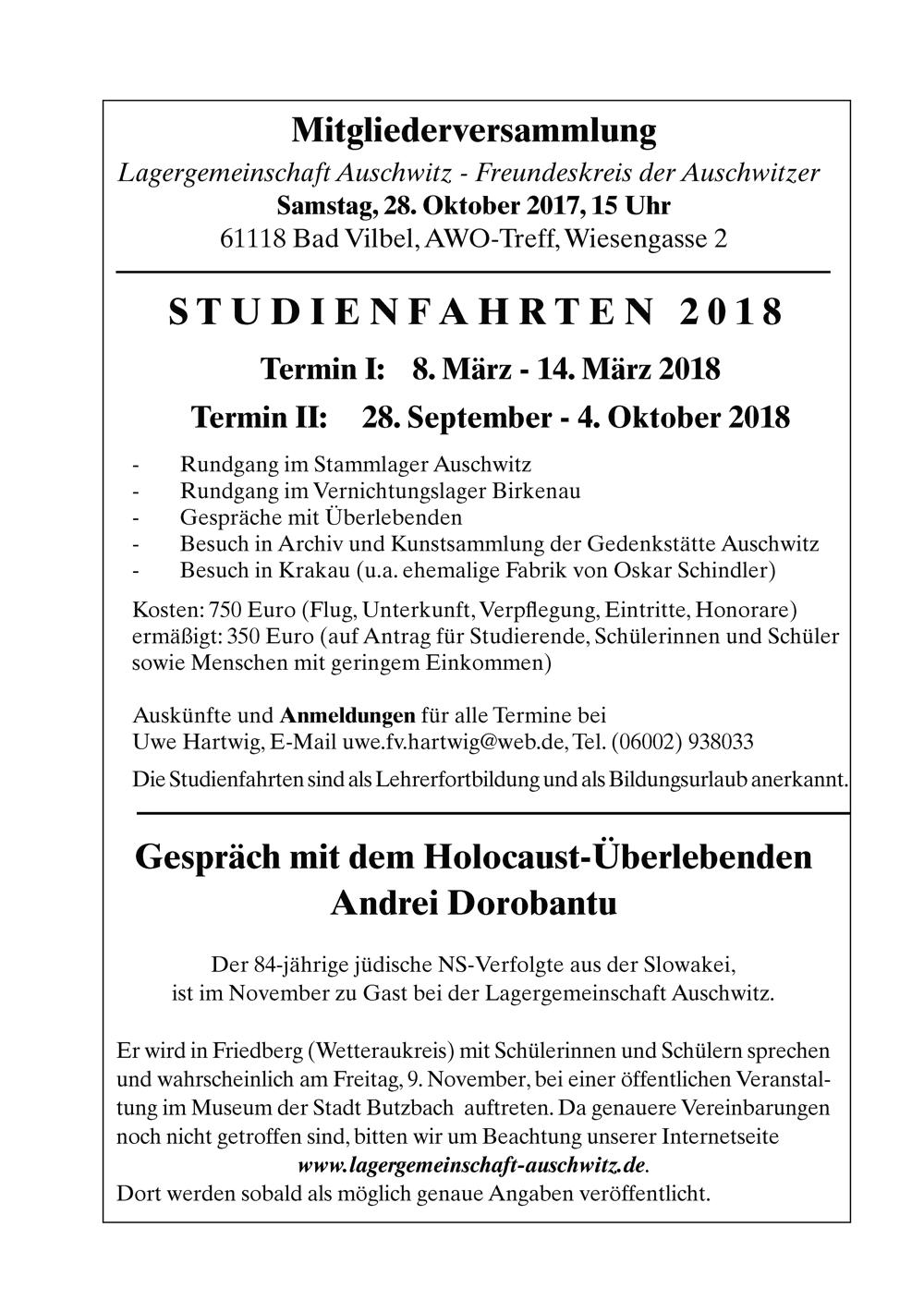 Lagergemeinschaft Auschwitz- FreundesKreis der Auschwitzer Samstag, 28. Oktober 2017, 15 Uhr 61118 Bad Vilbel, AWO-Treff, Wiesengasse 2