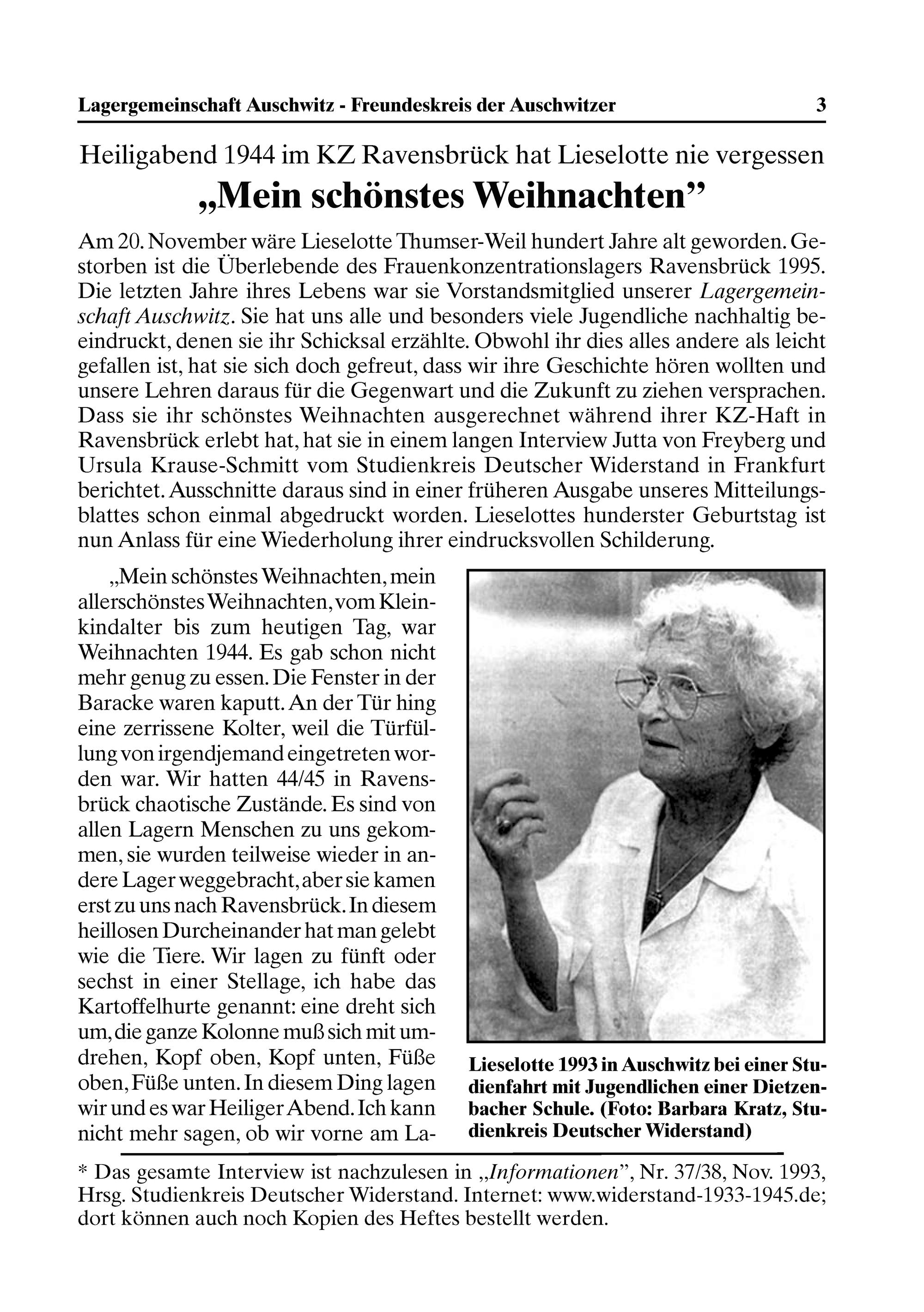 Am 20. November wäre Lieselotte Thumser-Weil hundert Jahre alt geworden. Ge- storben ist die Uberlebende des Frauenkonzentrationslagers Ravensbrück 1993. Die let?ten Jahre ihres Lebens war sie Vorstandsmitglied unserer Lagergemein- Schaft Alschwitz. Sie hat uns alle und besonders viele Jugendliche nachhaltig be- eindruckt, denen sie ihr Schicksal erzählte. Obwohl ihr dies alles andere als leicht gefallen ist, hat sie sich doch gefreut, dass wir ihre Geschichte hören wollten und unsere Lehren daraus für die Gegenwart und die Zukunft zu ziehen versprachen. Dass sie ihr schönstes Weihnachten ausgerechnet während ihrer KZ-Haft in Ravensbrück erlebt hat, hat sie in einem langen Interview Nutta von Freyberg und Ursula Krause-Schmitt vom Studienkreis Deutscher Widerstand in Frankfurt berichtet. Ausschnitte daraus sind in einer früheren Ausgabe unseres Mitteilungs- blattes schon einmal abgedruckt worden. Lieselottes hunderster Geburtstag ist nun Anlass für eine Wiederholung ihrer eindrucksvollen Schilderung.