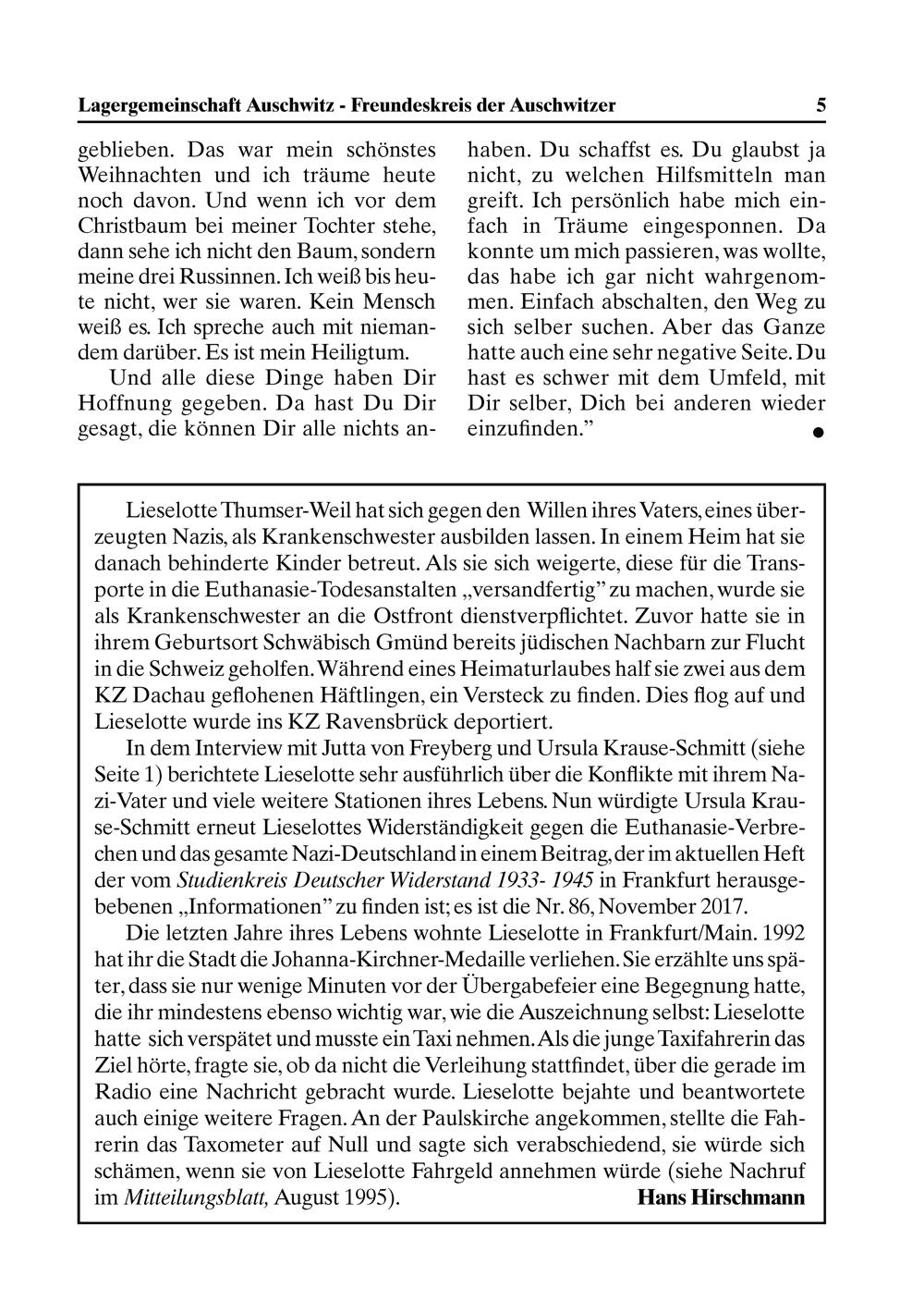 In dem Interview mit Jutta von Freyberg und Ursula Krause-Schmitt(iehe Seite 1) berichtete Lieselotte sehr ausführlich über die Konflikte mit ihrem Na- zi-Vater und viele weitere Stationen ihres Lebens. Nun würdigte Ursula Krau- se-Schmitt erneut Hieselottes Widerständigkeit gegen die Euthanasie-Verbre- chen und das gesamte Nazi-Deutschland in einem Beitrag, der im aktuellen Heft der vom Sudienkreis Pelscher Widerstand 7053. 104 in Frankfurt herausge- bebenen„Informationen? zu finden ist; es ist die Nr. 86, November 2017.