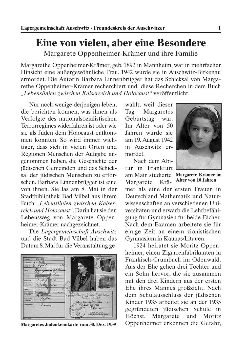 Margarethe Oppenheimer-Krämer, geb. 1892 in Mannheim, war in mehrfacher Hinsicht eine außergewöhnliche Frau. 1942 wurde sie in Auschwit?-Birkenau ermordet. Die Autorin Barbara Linnenbrügger hat das Schicksal von Marga- rethe Oppenheimer-Krämer recherchiert und diese Recherchen in dem Buch „Lebenslinien z wischen Kaiserreich und Holocaust“ veröffentlicht.