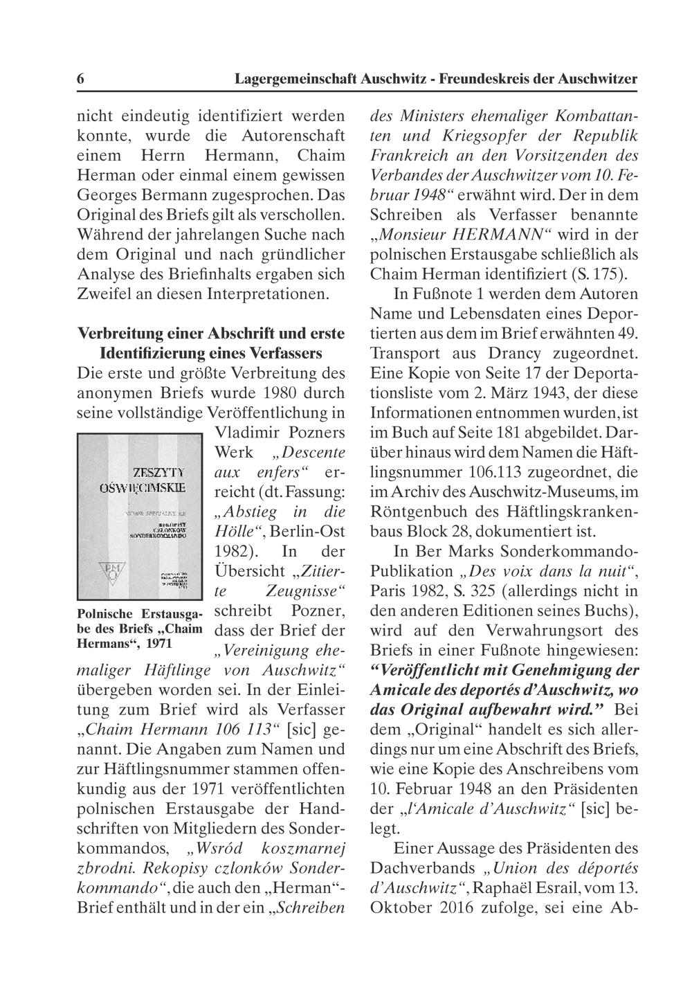 des Ministers ehemaliger Komhattan- ten lind Kriegsopfer der Repuhlik rankreich an den Vorsitzenden des Vorhundes der Auschwitzer vom 10. Fe- hruar IMs erwähnt wird. Der in dem Schreiben als Verfasser benannte „Monsieur HERMANMMW wird in der polnischen Erstausgabe schließlich als Chaim Herman identifiziert(S. 175).