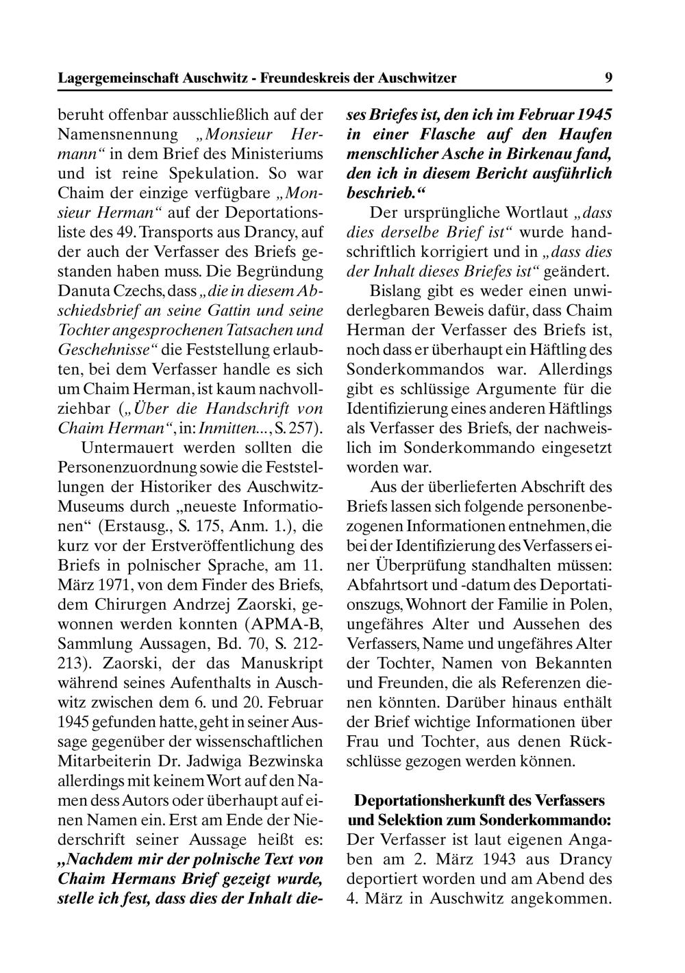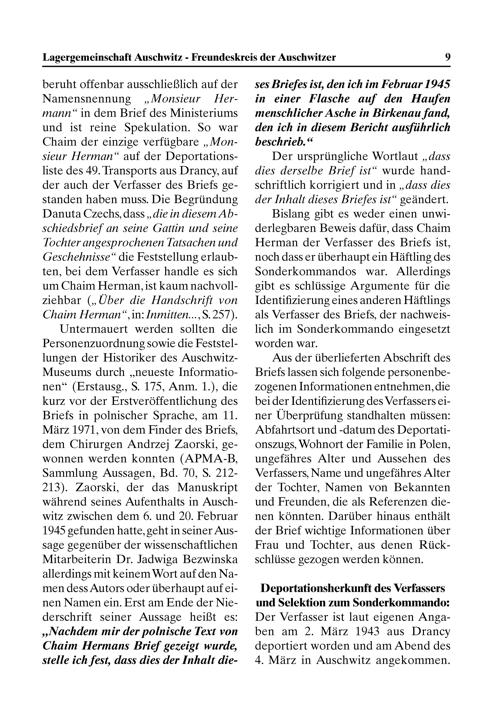 Bislang gibt es weder einen unwi- derlegbaren Beweis dafür, dass Chaim Herman der Verfasser des Briefs ist, noch dass er ũberhaupt ein Hãäftling des Sonderkommandos war. Allerdings gibt es schlüssige Argumente für die Identifizierung eines anderen Hãftlings als Verfasser des Briefs, der nachweis- lich im Sonderkommando eingesetzt worden war.