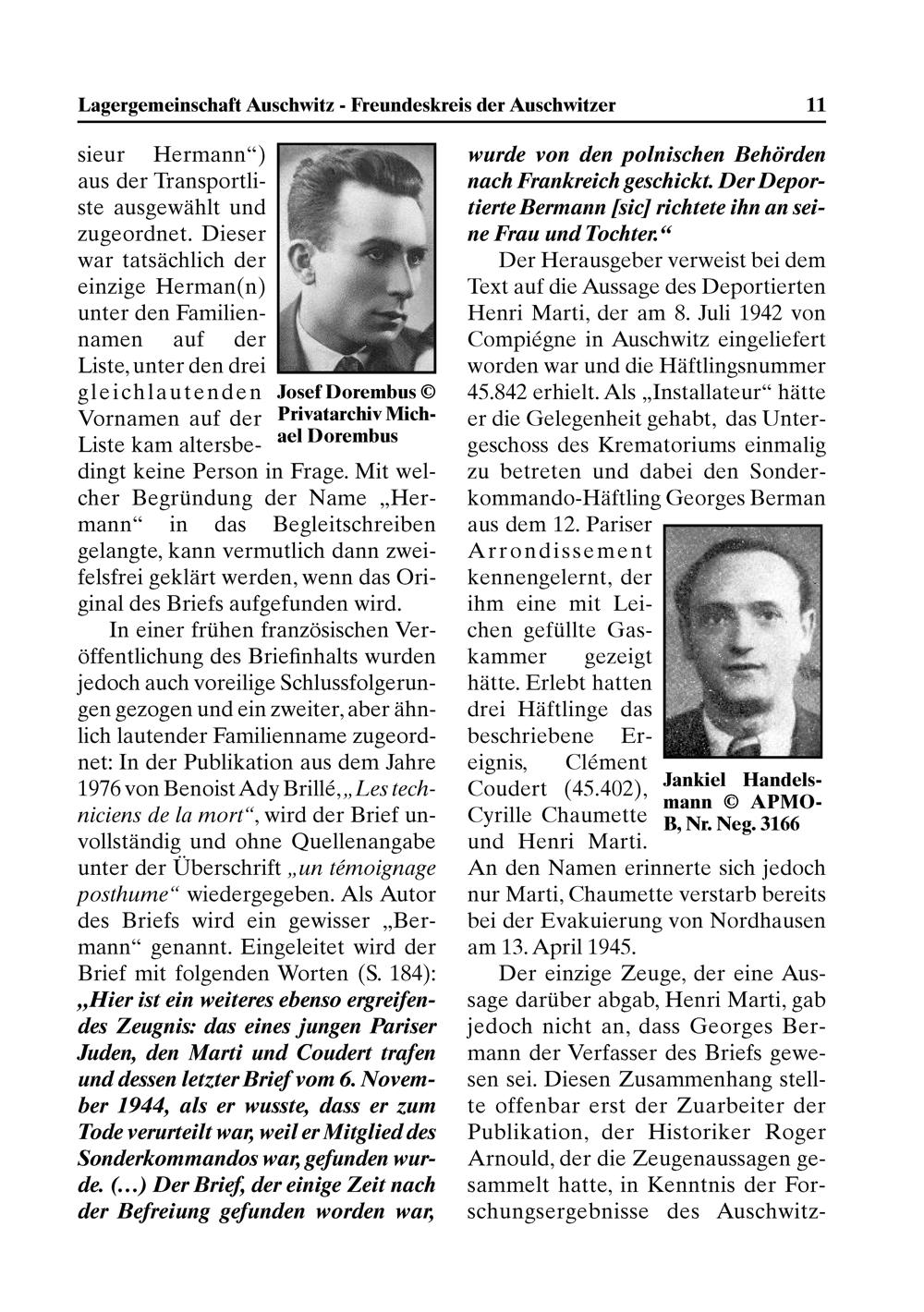 Der einzige Zeuge, der eine Aus- sage darüber abgab, Henri Marti, gab jedoch nicht an, dass Georges Ber- mann der Verfasser des Briefs gewe- Sen sei. Diesen Zusammenhang stel- te offenbar erst der Zuarbeiter der Publikation, der Historiker Roger Arnould, der die Zeugenaussagen ge- sammelt hatte, in Kenntnis der For- schungsergebnisse des Auschwitz-