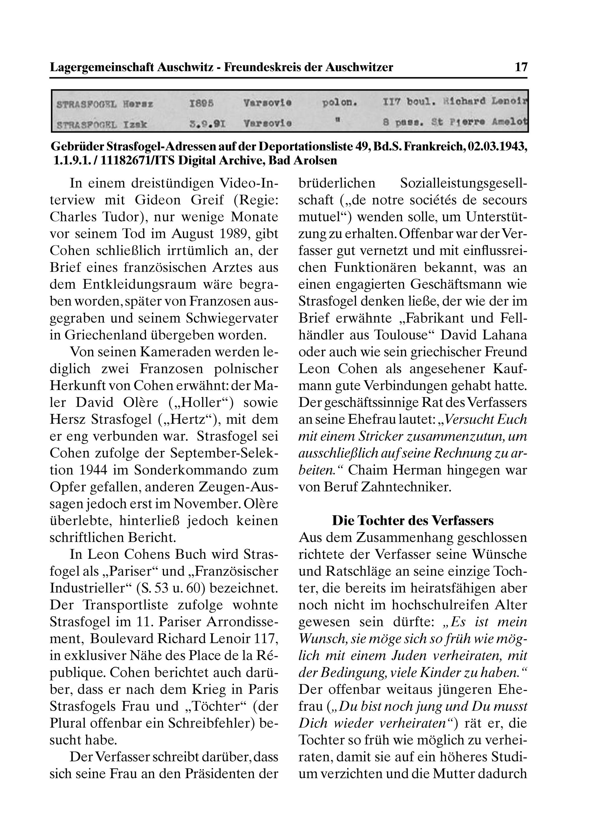 In Leon Cohens Buch wird Stras- fogel als„Pariser“ und„Franzõsischer Industrieller“(S. 53 u. 60) bezeichnet. Der Transportliste zufolge wohnte Strasfogel im 11. Pariser Arrondisse- ment, Boulevard Richard Lenoir 117, in exklusiver Nähe des Place de la Ré- publique. Cohen berichtet auch darü- ber, dass er nach dem Krieg in Paris Strasfogels Frau und„Töchter“(der Plural offenbar ein Schreibfehler) be- sucht habe.