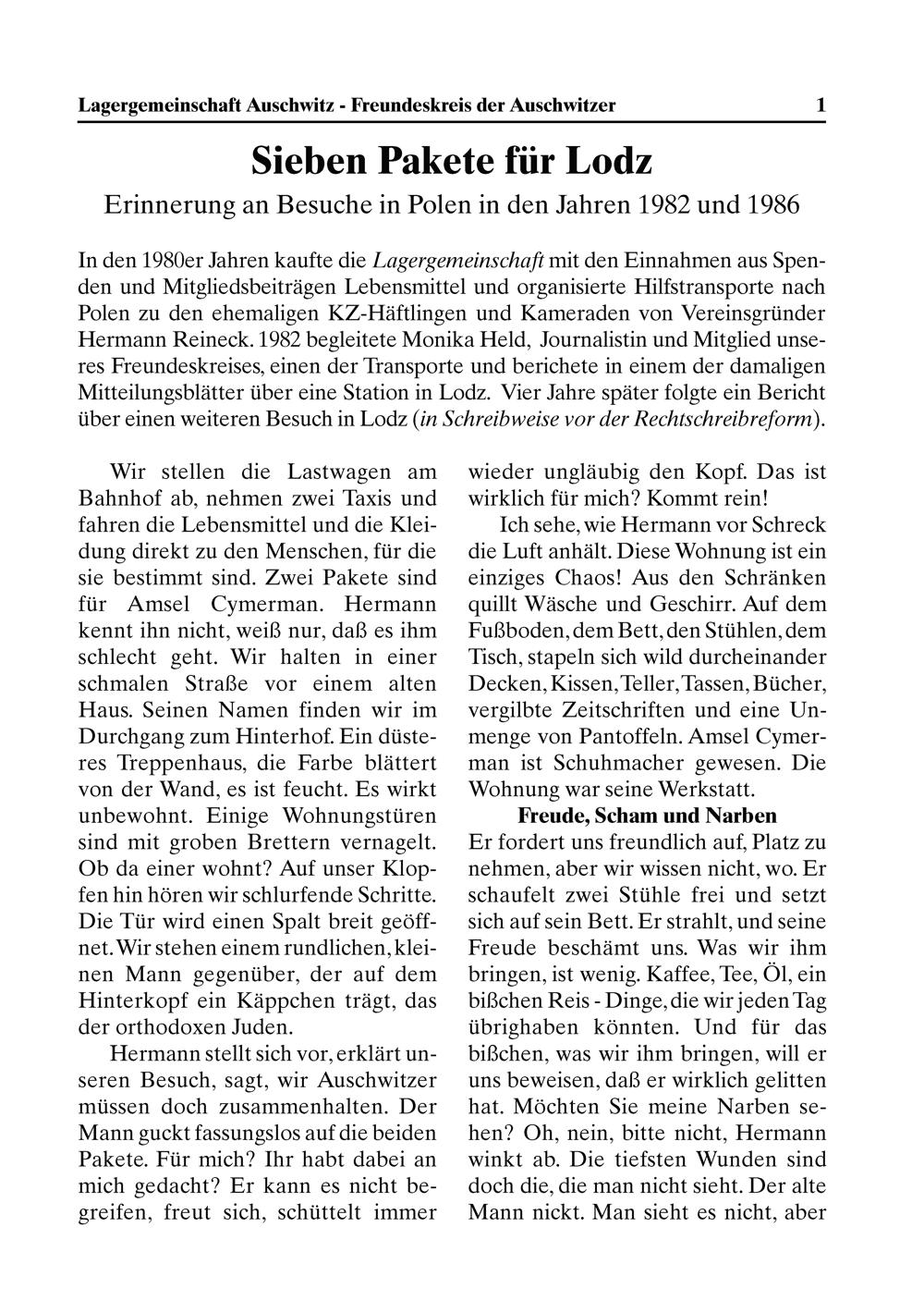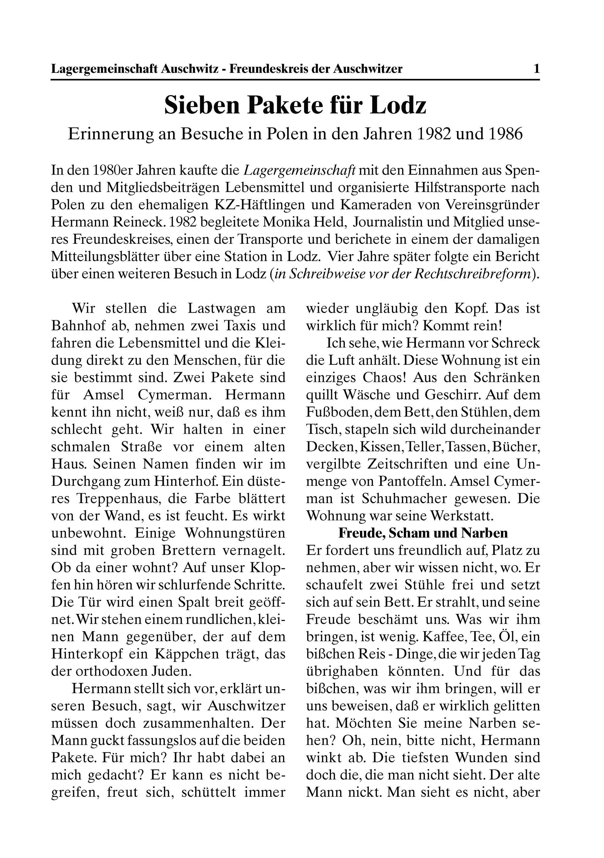 In den 1980er Jahren kaufte die Lagergemeinschaft mit den Einnahmen aus Spen- den und Mitgliedsbeiträgen Lebensmittel und organisierte Hilfstransporte nach Polen zu den ehemaligen KZ-Häftlingen und Kameraden von Vereinsgründer Hermann Reineck. 1982 begleitete Monika Held, Journalistin und Mitglied unse- res Freundeskreises, einen der Hansporte und berichete in einem der damaligen Mitteilungsblätter über eine Station in Lodz. Vier Jahre später folgte ein Bericht über einen weiteren Besuch in Lodz(in Schreib weise vor der Rechtschreibreform).