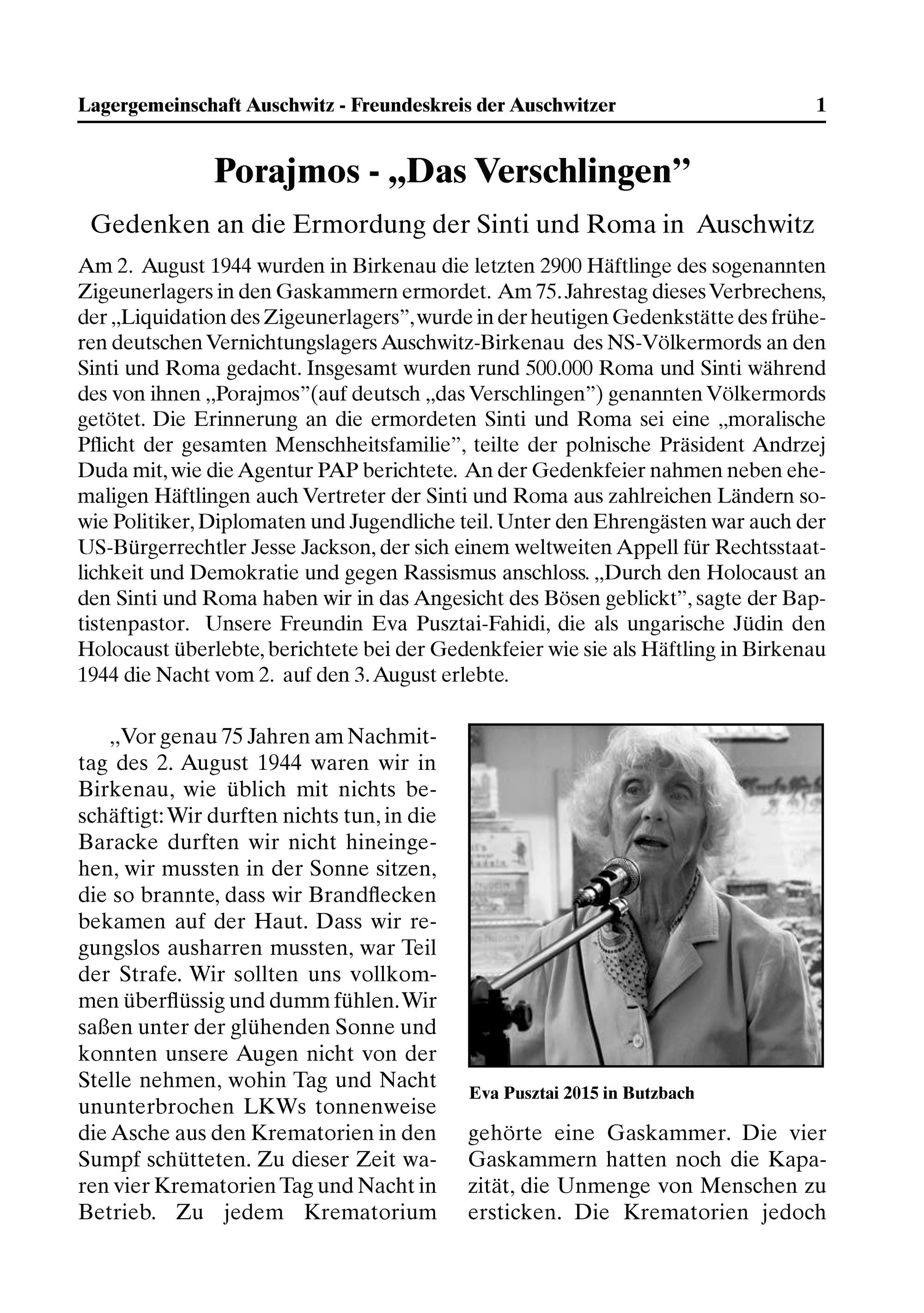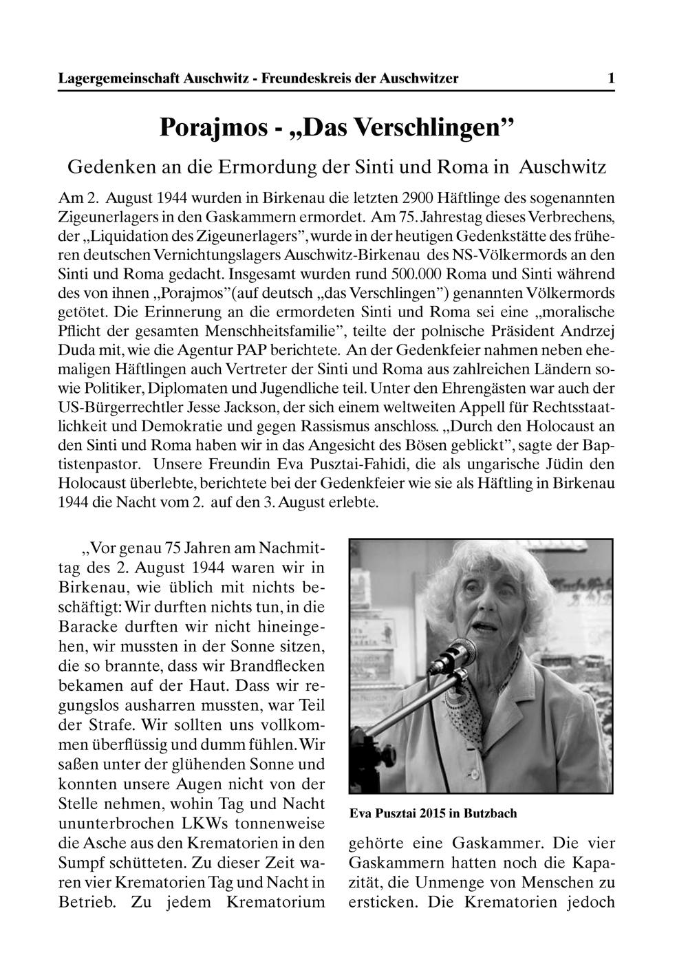 Am 2. August 1944 wurden in Birkenau die letzten 2900 Häftlinge des sogenannten Zigeunerlagers in den Gaskammern ermordet. Am 75. Jahrestag dieses Verbrechens, der„Liquidation des Zigeunerlagers“, wurde in der heutigen Gedenkstätte des frühe- ren deutschen Vernichtungslagers Auschwitz-Birkenau des NS-Völkermords an den Sinti und Roma gedacht. Insgesamt wurden rund 3500.000 Roma und Sinti wãhrend des von ihnen„Porajmos(auf deutsch„das Verschlingen“) genannten Völkermords getötet. Die Brinnerung an die ermordeten Sinti und Roma sei eine„moralische Pflicht der gesamten Menschheitsfamilie“, teilte der polnische Präsident Andrzej Duda mit, wie die Agentur PAP berichtete. An der Gedenkfeier nahmen neben ehe- maligen Häftlingen auch Vertreter der Sinti und Roma aus Zahlreichen Ländern so— wie Politiker, Diplomaten und Jugendliche teil. Unter den Ehrengästen war auch der US-Bürgerrechtler Jesse Jackson, der sich einem weltweiten Appell für Rechtsstaat- lichkeit und Demokratie und gegen Rassismus anschloss.„Durch den Holocaust an den Sinti und Roma haben wir in das Angesicht des Bösen geblickt“, sagte der Bap- tistenpastor. Unsere Freundin Eva Pus?tai-Fahidi, die als ungarische Jüdin den Holocaust überlebte, berichtete bei der Gedenkfeier wie vie als Hãftling in Birkenau 1944 die Nacht vom 2. auf den 3. August erlebte.