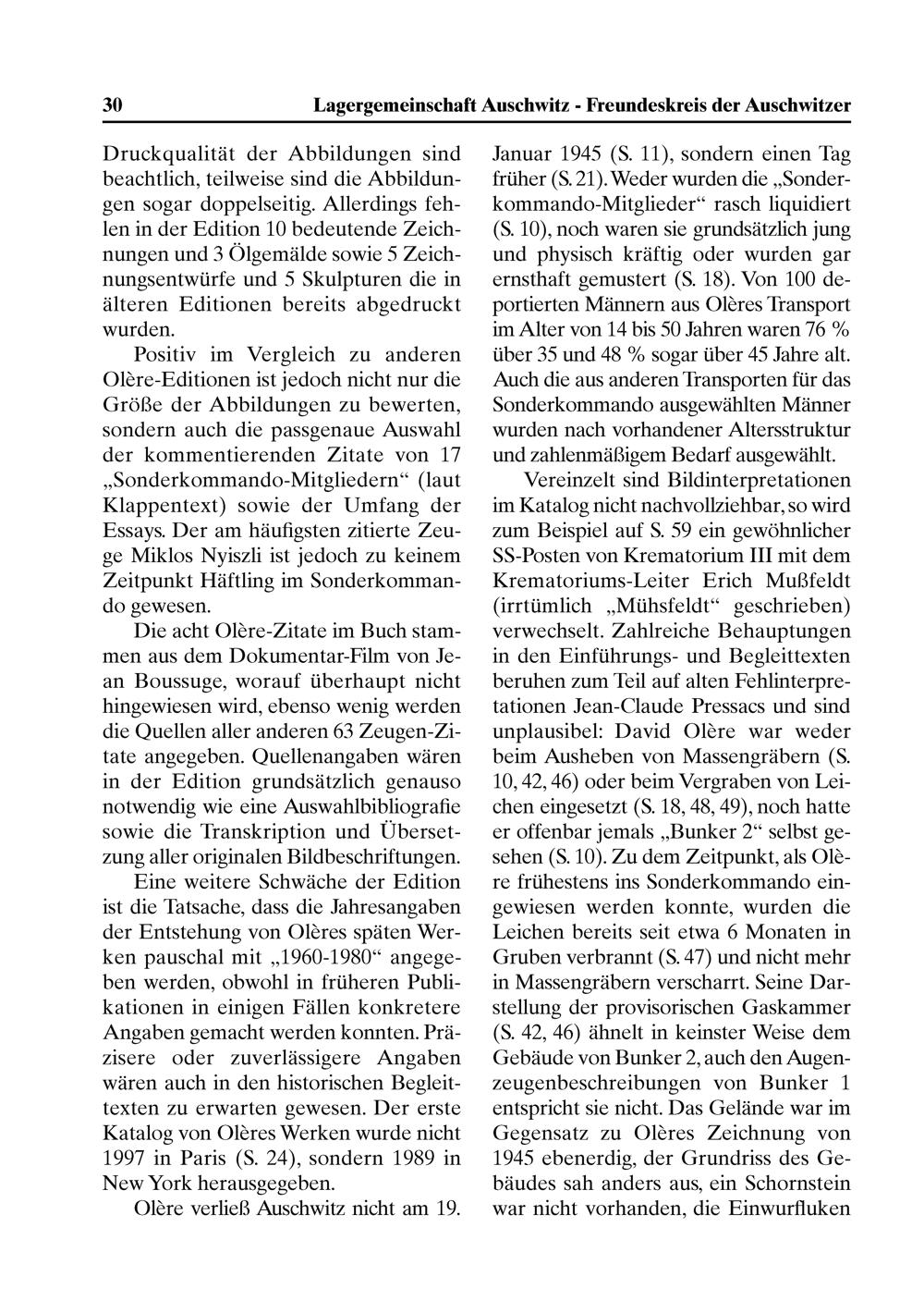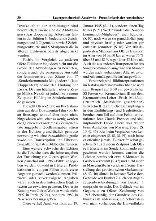 Positiv im Vergleich zu anderen Olère-Fditionen ist jedoch nicht nur die Größe der Abbildungen zu bewerten, sondern auch die passgenaue Auswahl der kommentierenden Zitate von 17 „Sonderkommando-Mitgliedern“(laut Klappentext) sowie der Umfang der FsSsays. Der am häufigsten zitierte Zeu- ge Miklos Nyiszli ist jedoch zu keinem Zeitpunkt Häftling im Sonderkomman- do gewesen.