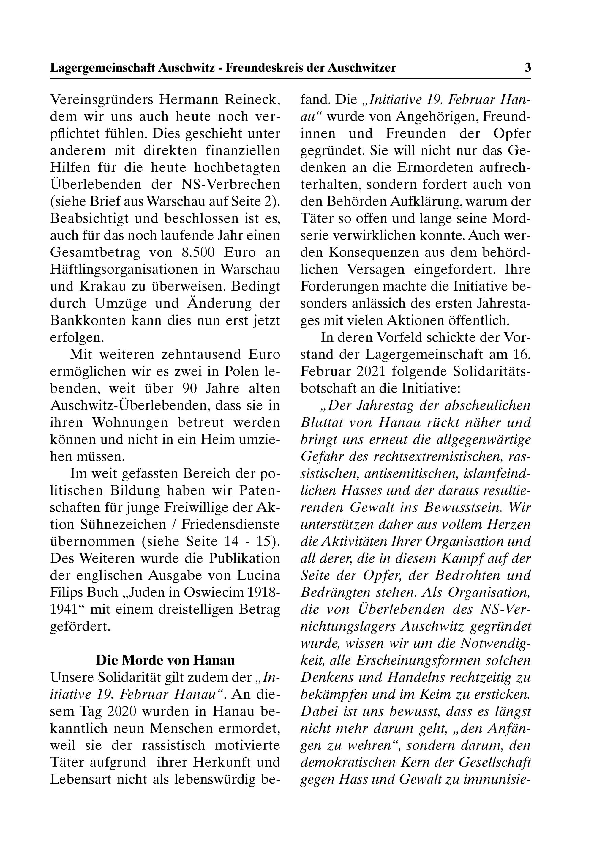 „Der Jhrestag der abscheulichen Bluttat von Hanau riickt näher und hringt uns ermneut die allgegen wärtige Gefahr des rechtsextremistischen, vas- vilischen, antisemitischen, islamfeind- lichen Hasses lind der daraus veslltie- renden Gewalt ins Bewlisslsein. Wir nterstiitzen daher aus vollem Herzen die A ktivitãten Mhrer Organisation und all deren die in diesem Kampf auf der Seile der Opfen der Bedrohten und Bedrängten stehen. Ab Oganisation, die von Uberlebenden des N Ver- nichtungslagers Aluschwitz gegriindet wMyrde, wissen wir lim die Notwendig- Keit, alle Ercheinungsformen solchen Denkcens und Handelns rechtzeitig zu helcdmpfen und im Keim zu ersticken. Mahei ist lins hewlssl, duss es ldngst nicht mehr darum geht„den Anfän- gen zu wehren“, sondern darum, den demohkratischen Kern der Gesellschaft gegen Hass und Gewalt zu immunisie-