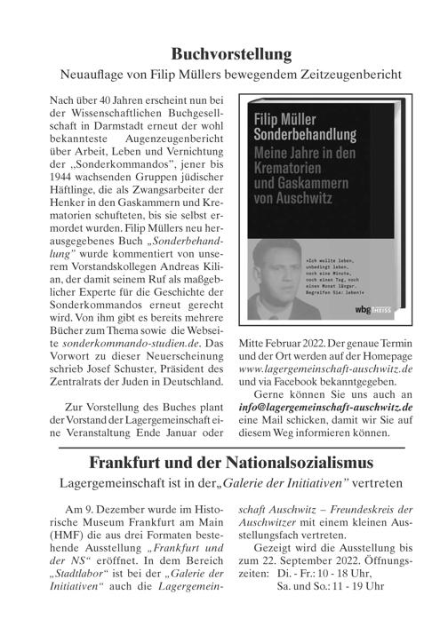 Nach über 40 Jahren erscheint nun bei der Wissenschaftlichen Buchgesell- schaft in Darmstadt erneut der wohl bekannteste Augenzeugenbericht über Arbeit, Leben und Vernichtung der„Sonderkommandos“, jener bis 1944 wachsenden Gruppen jüdischer Häftlinge, die als Zwangsarbeiter der Henker in den Gaskammern und Kre- matorien schufteten, bis sie selbst er- mordet wurden. Hlip Müllers neu her- ausgegebenes Buch„Sonderbehand- jung“ wurde kommentiert von unse- rem Vorstandskollegen Andreas Kili- an, der damit seinem Ruf als maßgeb- licher EFxperte für die Geschichte der Sonderkommandos erneut gerecht wird. Von ihm gibt es bereits mehrere Bücher zum Thema sowie die Websei- te vonderkommando-studien. de. Das Vorwort Zu dieser Neuerscheinung schrieb Josef Schuster, Präsident des Zentralrats der Juden in Deutschland.