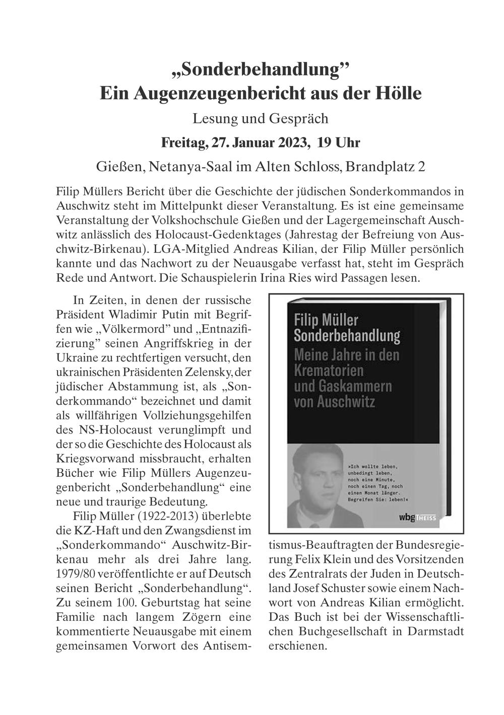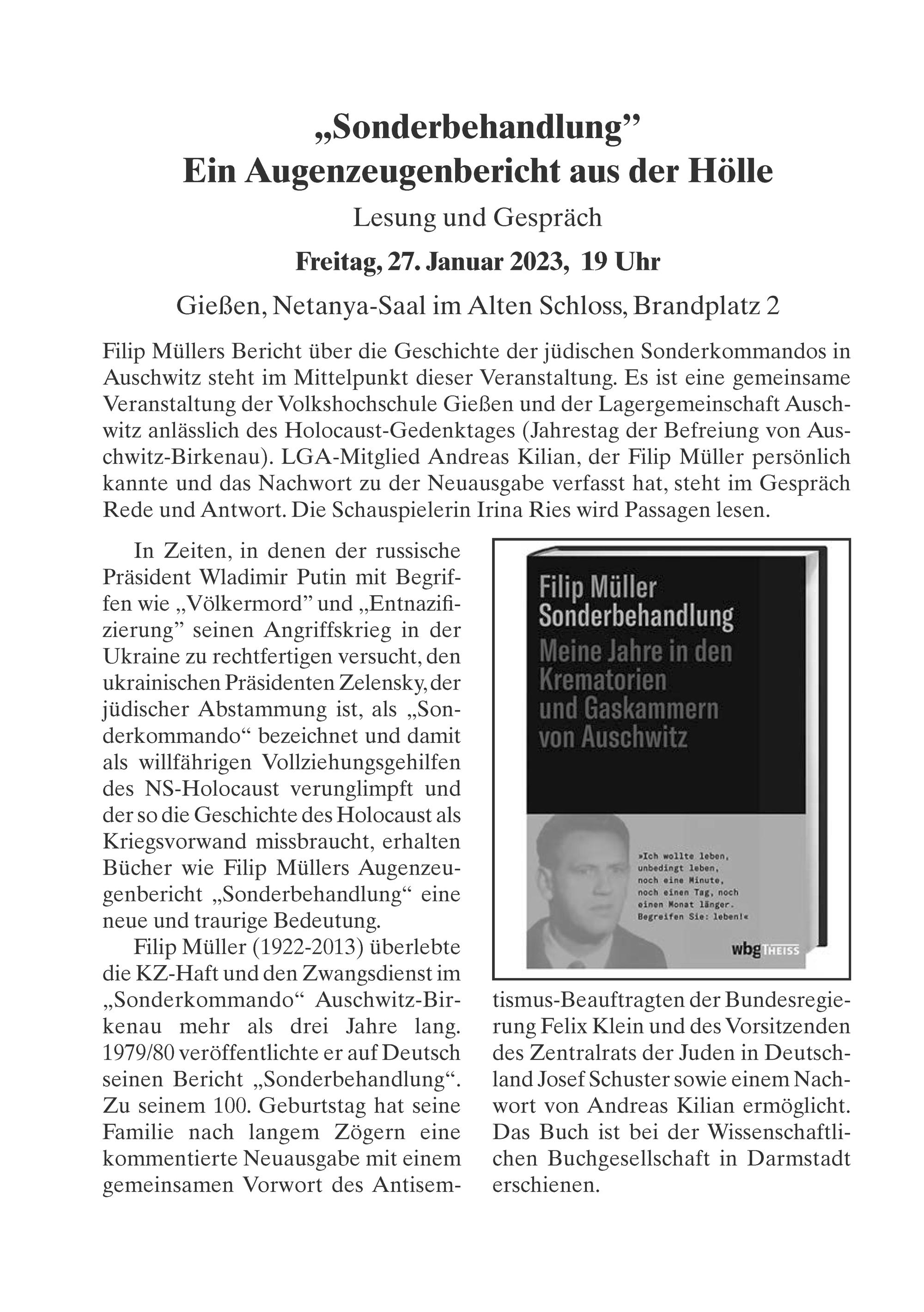 Filip Müllers Bericht über die Geschichte der jüdischen Sonderkommandos in Auschwit? steht im Mittelpunkt dieser Veranstaltung. Es ist eine gemeinsame Veranstaltung der Volkshochschule Gießen und der Lagergemeinschaft Ausch- wit? anlãsslich des Holocaust-Gedenktages(Jahrestag der Befreiung von Aus- chwitz-Birkenau). LGA-Mitglied Andreas Kilian, der Filip Müller persönlich kannte und das Nachwort zu der Neuausgabe verfasst hat, steht im Gespräch