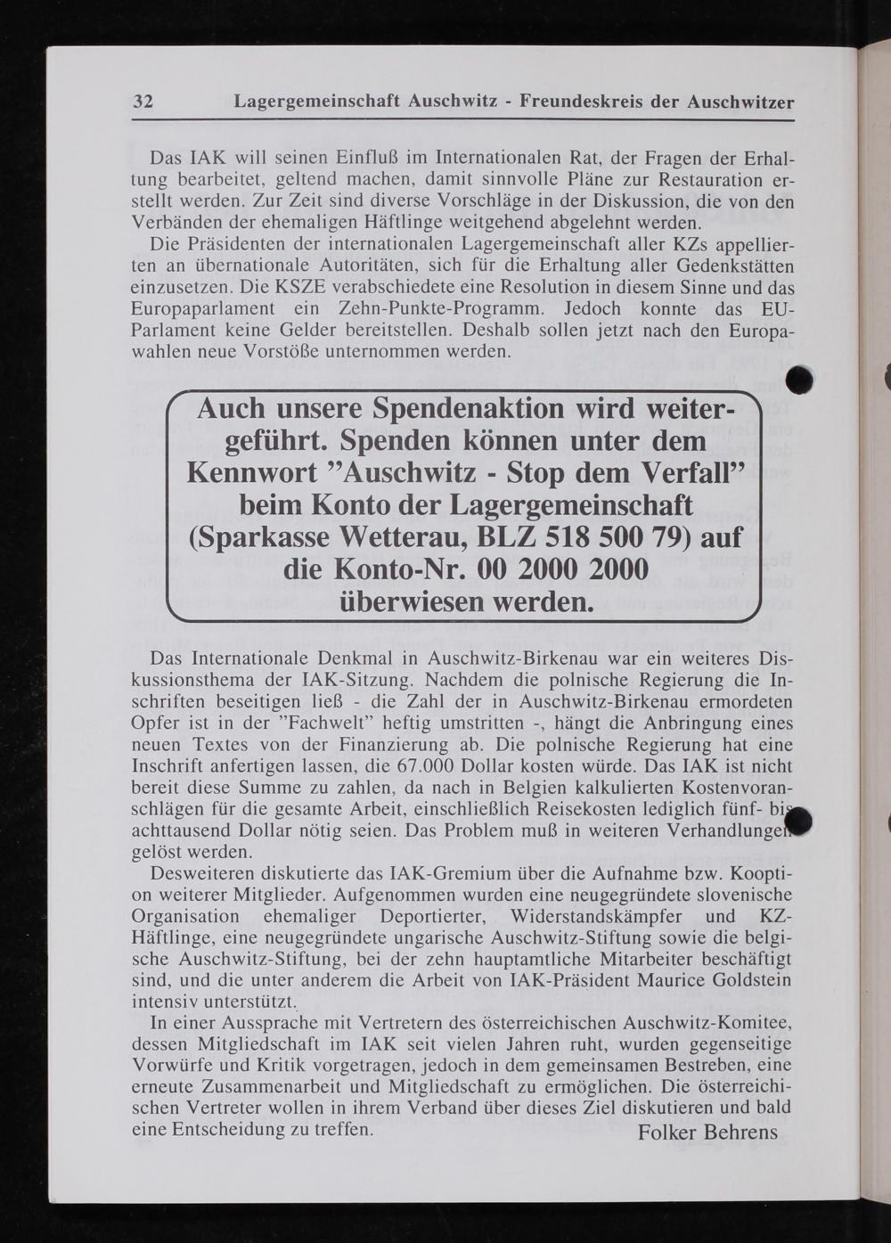 Auch unsere Spendenaktion wird weiter- geführt. Spenden können unter dem Kennwort Auschwitz-Stop dem Verfall beim Konto der Lagergemeinschaft Sparkasse Wetterau, BLZ 518 500 79) auf