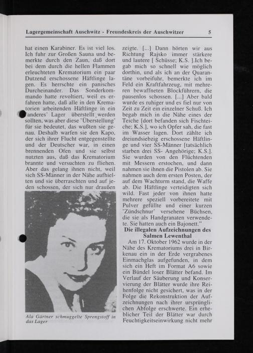 Am 17. Oktober 1 962 wurde in der Nähe des Krematoriums drei in Bir- kenau ein in der Erde vergrabenes Einmachglas aufgefunden, in dem sich ein Heft im Format A6 sowie ein Bündel loser Blätter befand. Im Verlauf der Säuberung und Konser- vierung der Blätter wurde ihre Rei- henfolge nicht gesichert, was in der Folge die Rekonstruktion der Auf- zeichnungen nach ihrer ursprüngli- chen Abfolge erschwerte. Ein erhe- blicher Teil der Blätter war durch Feuchtigkeitseinwirkung nicht mehr