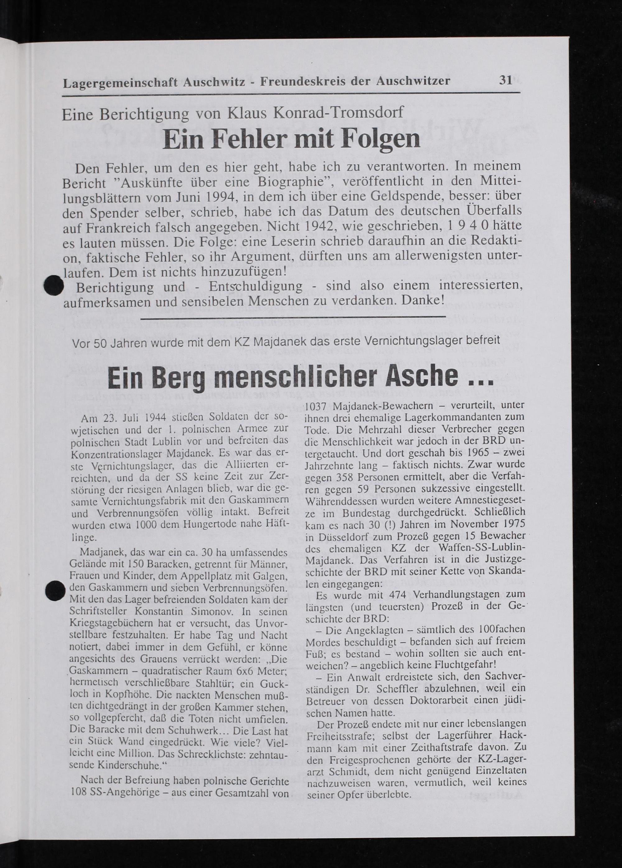 Den Fehler, um den es hier geht, habe ich zu verantworten. In meinem Bericht Auskünfte über eine Biographie“, veröffentlicht in den Mittei- lungsblãttern vom Juni 1994, in dem ich über eine Geldspende, besser: über den Spender selber, schrieb, habe ich das Datum des deutschen Uberfalls auf Frankreich falsch angegeben. Nicht 1942, wie geschrieben, 1 9 4 0 hätte es lauten müssen. Die Folge: eine Leserin schrieb daraufhin an die Redakti- on, faktische Fehler, so ihr Argument, dürften uns am allerwenigsten unter-
