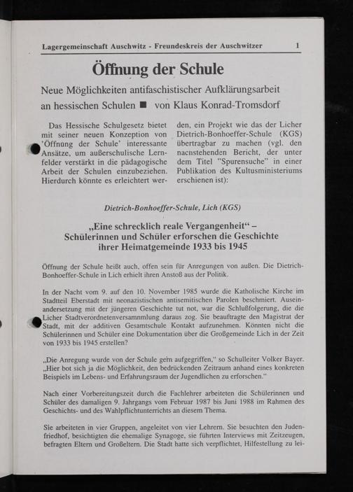 Das Hessische Schulgesetz bietet den, ein Projekt wie das der Licher mit seiner neuen Konzeption von Dietrich-Bonhoeffer-Schule(KGs) öffnung der Schule' interessante übertragbar zu machen(vgl. den Ansätze, um außerschulische Lern- nachstehenden Bericht, der unter felder verstärkt in die pädagogische dem Titel'Spurensuche“ in einer Arbeit der Schulen einzubeziehen. Publikation des Kultusministeriums Hierdurch könnte es erleichtert wer- erschienen ist):