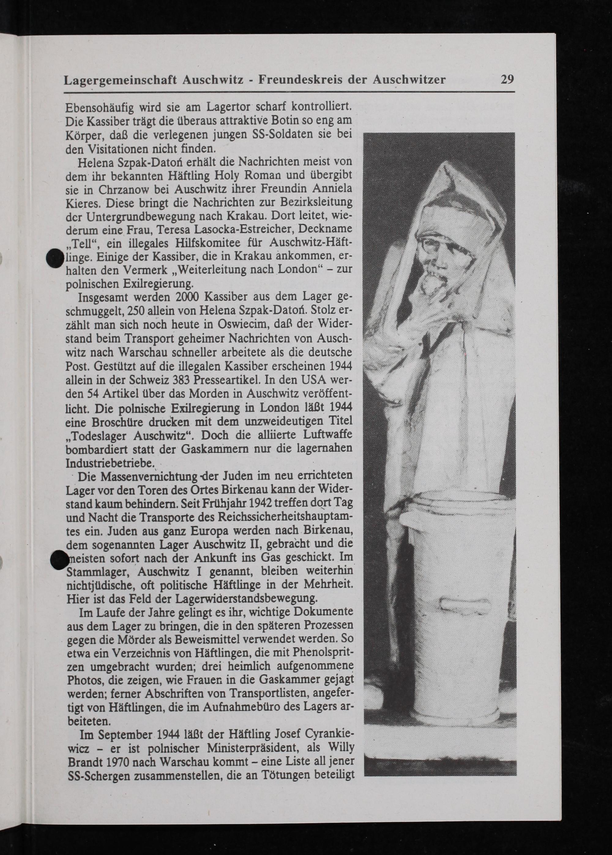 sie in Chrzanow bei Auschwitz ihrer Freundin Anniela Kieres. Diese bringt die Nachrichten zur Bezirksleitung der Untergrundbewegung nach Krakau. Dort leitet, wie- derum eine Frau, Teresa Lasocka-Estreicher, Deckname „Tell“, ein illegales Hilfskomitee für Auschwitz-Häft- linge. Einige der Kassiber, die in Krakau ankommen, er- halten den Vermerk„Weiterleitung nach London“— zur polnischen Exilregierung.