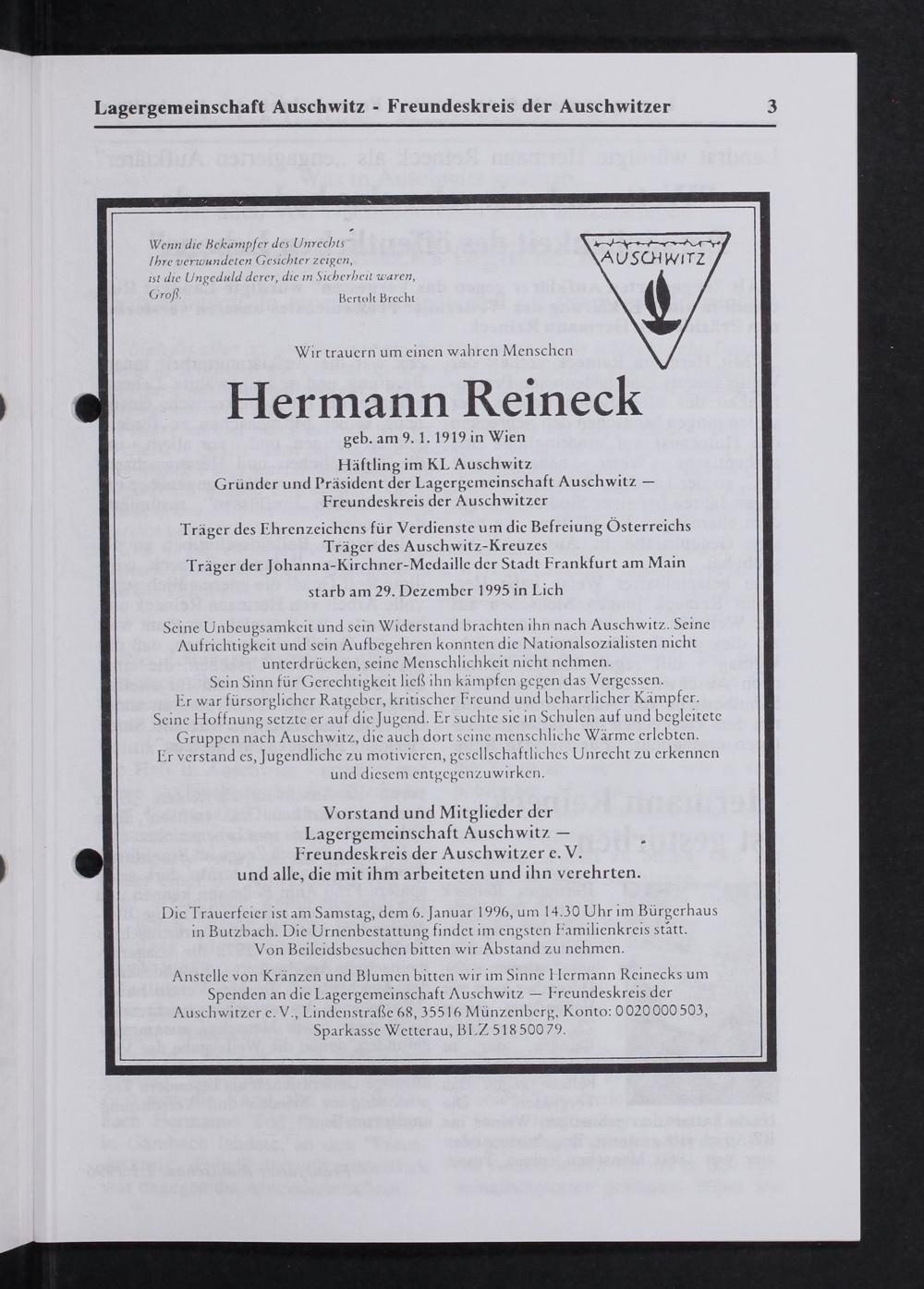 Anstelle von Kränzen und Blumen bitten wir im Sinne Hlermann Reinecks um Spenden an die Lagergemeinschaft Auschwitz— Freundeskreis der Muschwitzer e. V., Lindenstraße 68, 35516 Münzenberg, Konto: 0 020 000 3503, Sparkasse Wetterau, BI-Z518 500 79.