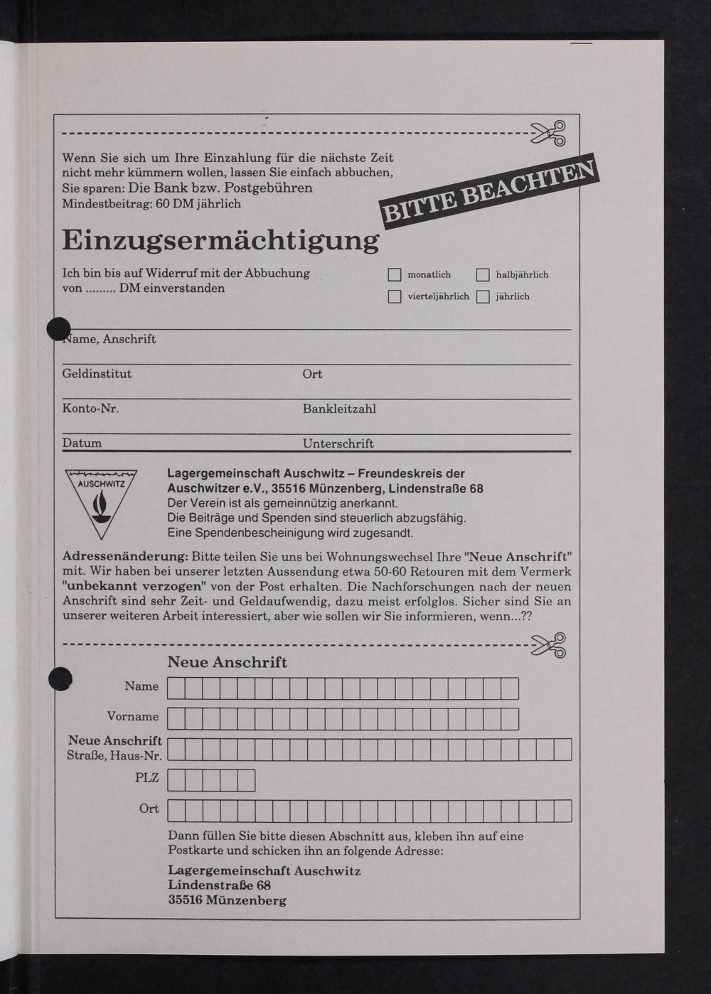 Ich bin bis auf Widerruf mit der Abbuchung Q monstlich halbjährlich DM einverstanden ſQ vereharien[I jhrlen Anschrift Geldinstitut Ort Konto- Nr. Bankleitzahl Datum Unterschrift Lagergemeinschaft Auschwitz— Freundeskreis der