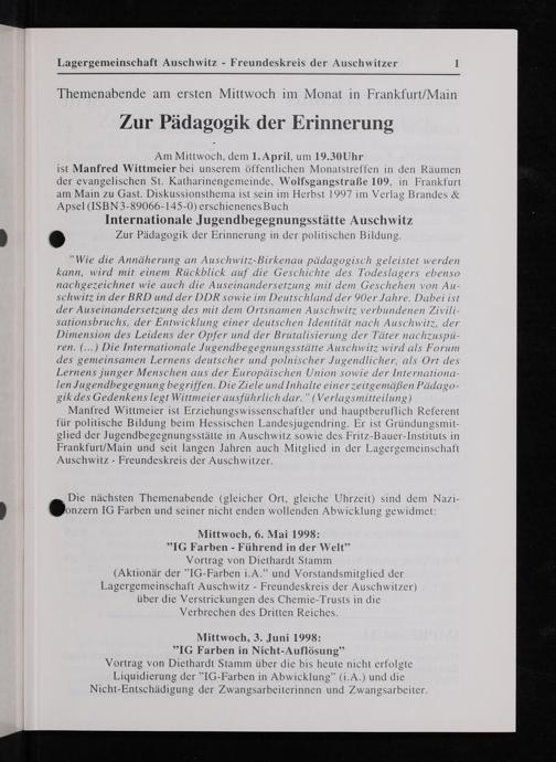 Mittwoch, 6. Mai 1998: »I6 Farben-Führend in der Welt'* Vortrag von Diethardt Stamm (Aktionär der*IG-Farben i. A.* und Vorstandsmitglied der Lagergemeinschaft Auschwitz- Freundeskreis der Auschwitzer) über die Verstrickungen des Chemie-Trusts in die Verbrechen des Dritten Reiches.
