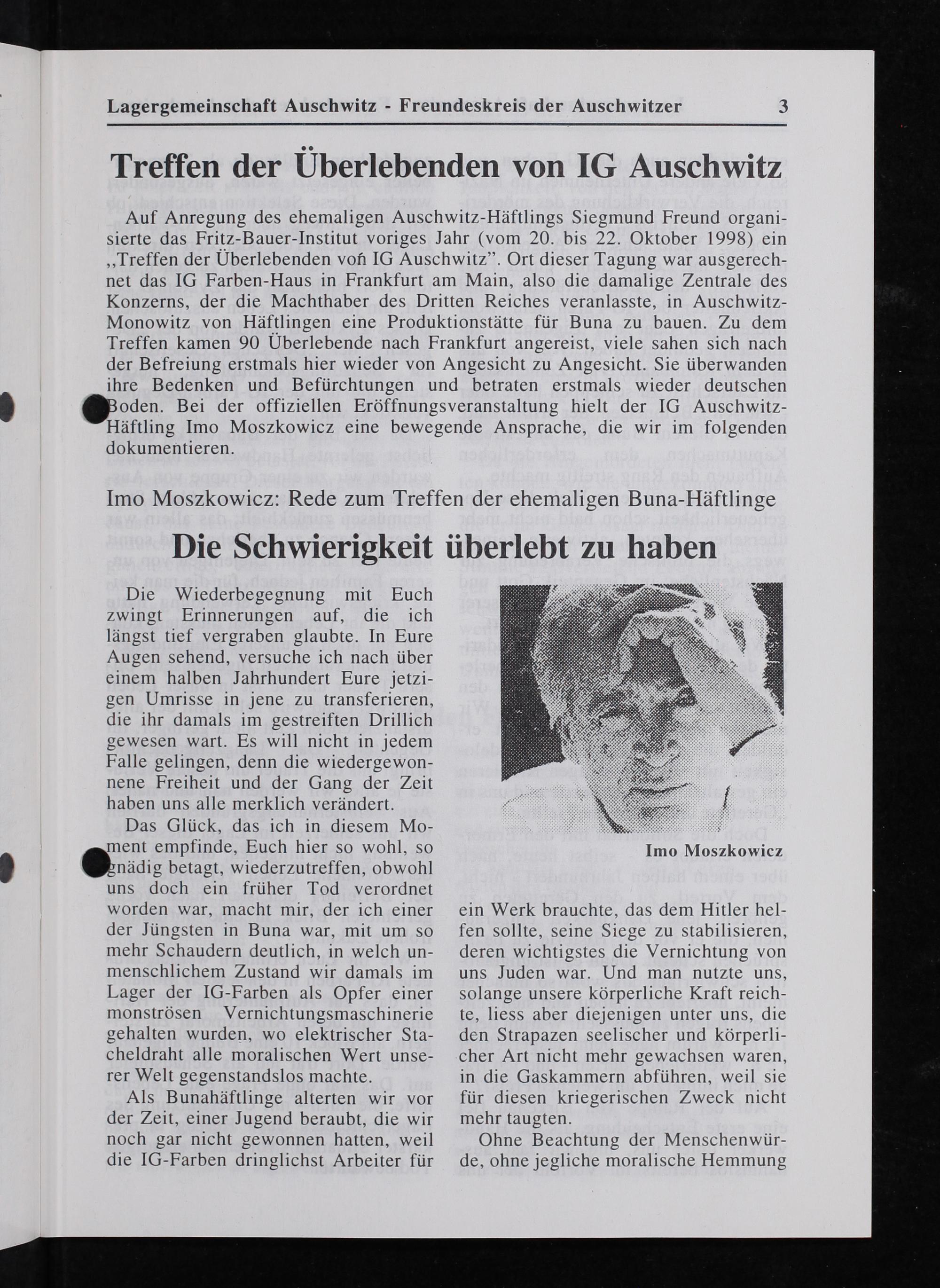 oden. Bei der offiziellen Eröffnungsveranstaltung hielt der I6 Auschwitz- Häftling Imo Moszkowicz eine bewegende Ansprache, die wir im folgenden dokumentieren.