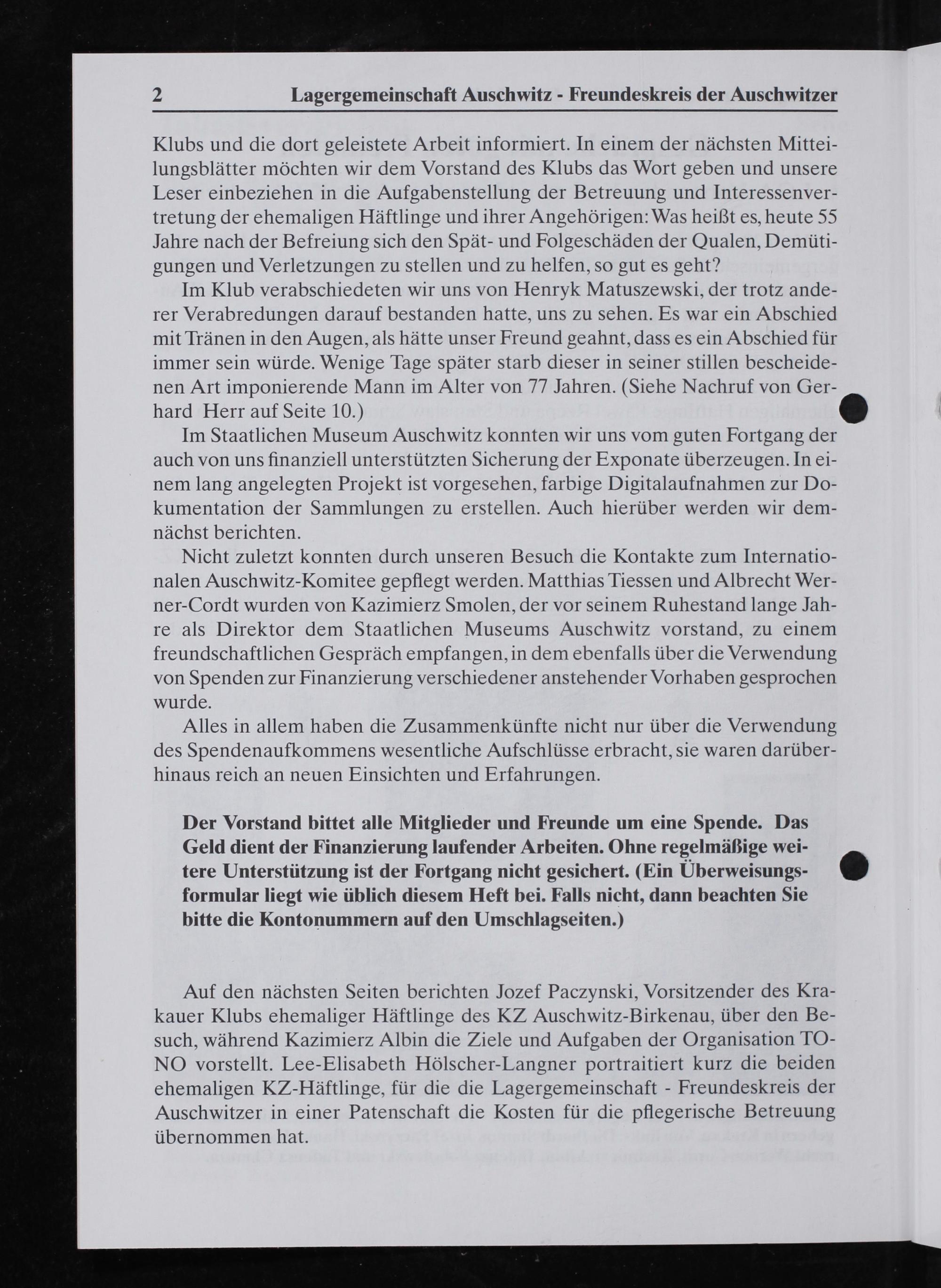 Auf den nächsten Seiten berichten Jozef Paczynski, Vorsitzender des Kra- kauer Klubs ehemaliger Häftlinge des KZ Auschwitz-Birkenau, über den Be- such, während Kazimierz Albin die Ziele und Aufgaben der Organisation TO- NO vorstellt. Lee-Flisabeth Hölscher-Langner portraitiert kurz die beiden ehemaligen KZHäftlinge, für die die Lagergemeinschaft-Freundeskreis der Auschwitzer in einer Patenschaft die Kosten für die pflegerische Betreuung übernommen hat.