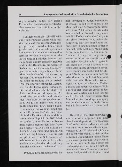 Auschwitz deportiert. Der 16 jãährige Stiefbruder meines Mannes hat sich von ihnen losgerissen und kommt ganz verstõrt zu uns. Wir sind ratlos kõnnen ihn nicht verbergen. so daß er den schweren Weg doch mit seinen Eltern gemeinsam gehen muß. In der Fabrik treffen wir uns am Morgen schon mit verängstigten Gesichtern. Es gibt im- mer neue Listen, Transporte, immer neues Leid, und die Kolleginnen sind