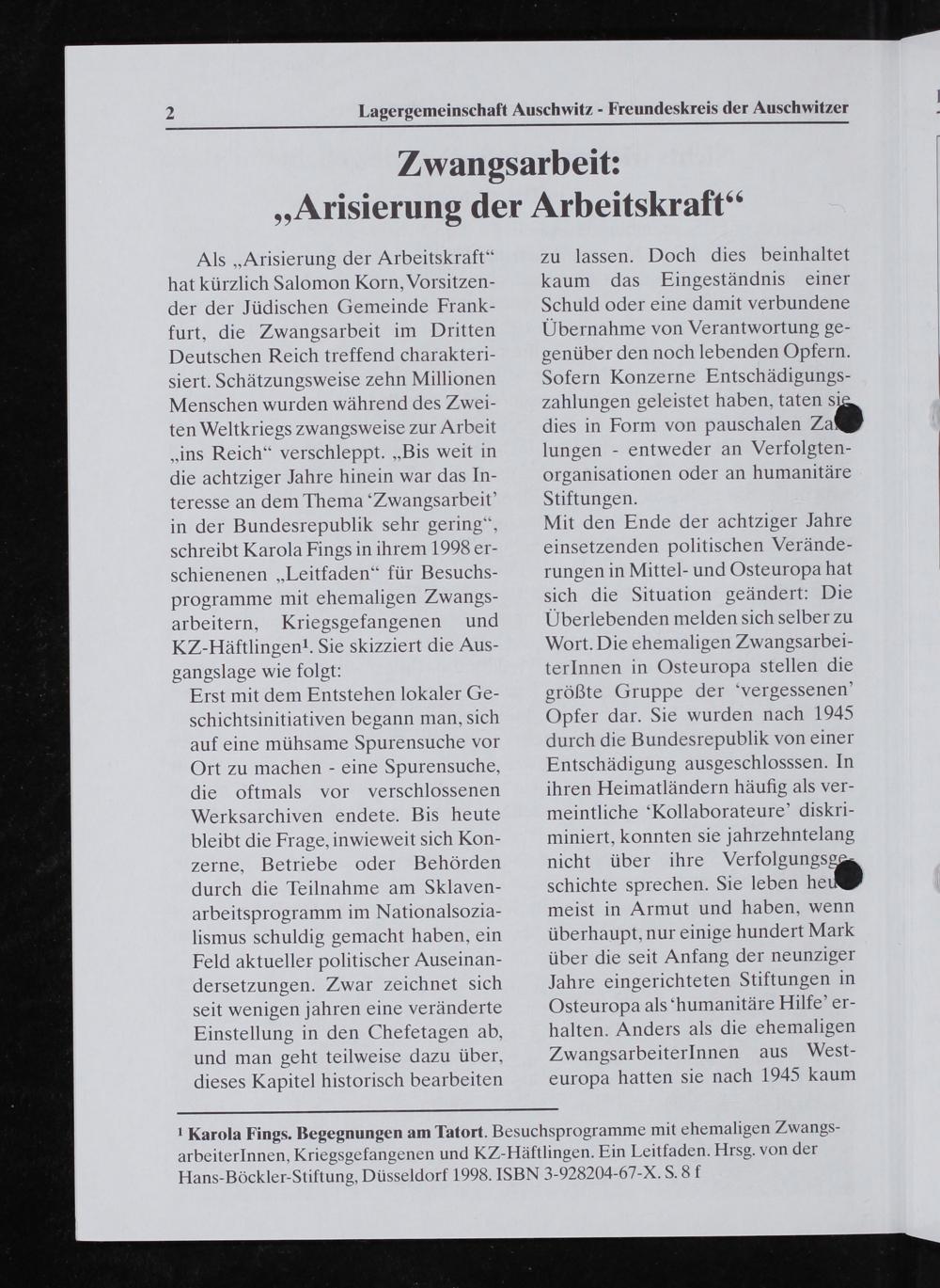 Als Arisierung der Arbeitskraft“ hat kürzlich Salomon Korn, Vorsitzen- der der Jüdischen Gemeinde Frank- furt, die Zwangsarbeit im Dritten Deutschen Reich treffend charakteri- siert. Schätzungsweise zehn Millionen Menschen wurden wãhrend des Zwei- ten Weltkriegs ⁊wangsweise zur Arbeit ins Reich“ verschleppt.„Bis weit in die achtziger Jahre hinein war das In- teresse an dem Thema Zwangsarbeit' in der Bundesrepublik sehr gering“, Schreibt Karola Fings in ihrem 1998 er- schienenen„Leitfaden“ für Besuchs- programme mit ehemaligen Zwangs- arbeitern, Kriegsgefangenen und KZHäftlingeni. Sie skizziert die Aus- gangslage wie folgt: