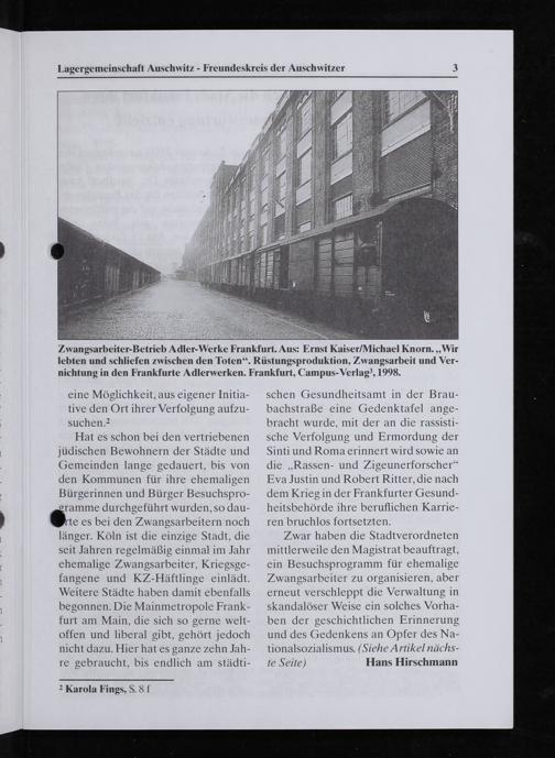 Zwar haben die Stadtverordneten mittlerweile den Magistrat beauftragt, ein Besuchsprogramm für ehemalige Zwangsarbeiter zu organisieren, aber erneut verschleppt die Verwaltung in skandalõser Weise ein solches Vorha- ben der geschichtlichen Erinnerung und des Gedenkens an Opfer des Na- tionalsozialismus. ¶Siehe Artikel nächs- 1e Seite) Hans Hirschmann