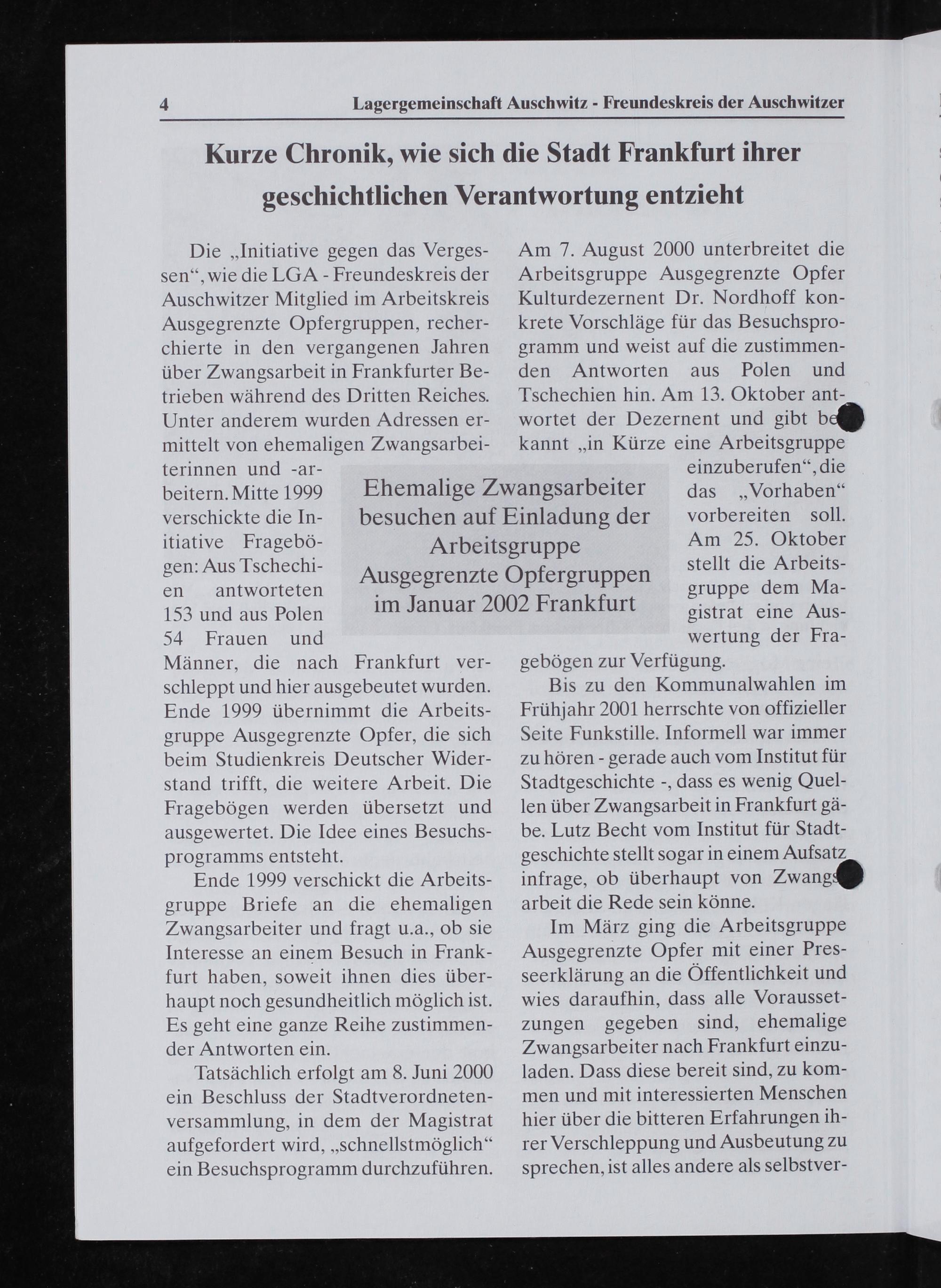 Die„Initiative gegen das Verges- sen“, wie die LGA Freundeskreis der Auschwitzer Mitglied im Arbeitskreis Ausgegrenzte Opfergruppen, recher- chierte in den vergangenen Jahren über Zwangsarbeit in Frankfurter Be- trieben während des Dritten Reiches. Unter anderem wurden Adressen er- mittelt von ehemaligen Zwangsarbei- terinnen und-ar- beitern. Mitte 1990 verschickte die In- itiative Fragebö- gen: Aus Tschechi- en antworteten 153 und aus Polen 54 Frauen und Männer, die nach Frankfurt ver- Schleppt und hier ausgebeutet wurden. Ende 1990 übernimmt die Arbeits- gruppe Ausgegrenzte Opfer, die sich beim Studienkreis Deutscher Wider- stand trifft, die weitere Arbeit. Die Fragebögen werden übersetzt und ausgewertet. Die Idee eines Besuchs- programms entsteht.