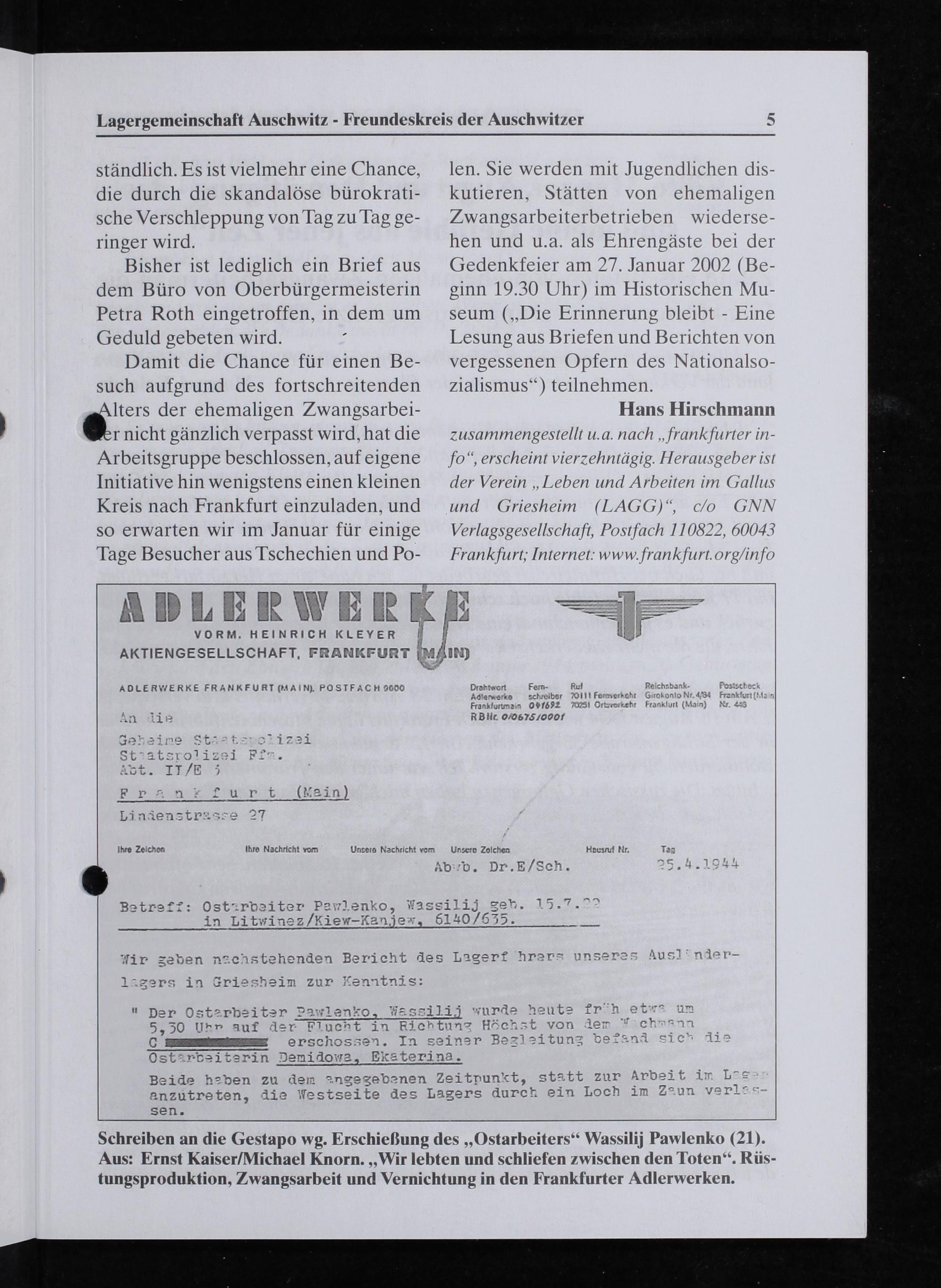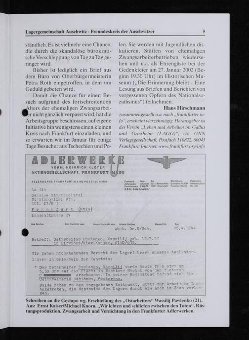 ständlich. Es ist vielmehr eine Chance, len. Sie werden mit Jugendlichen dis- die durch die skandalöse bürokrati- kutieren, Stätten von ehemaligen sche Verschleppung von Tag zu Tag ge- Zwangsarbeiterbetrieben wiederse- ringer wird. hen und u. a. als Ehrengäste bei der Bisher ist lediglich ein Brief aus Gedenkfeier am 27. Januar 2002(Be- dem Büro von Oberbürgermeisterin ginn 19.30 Uhr) im Historischen Mu- Petra Roth eingetroffen, in dem um seum(„Die Erinnerung bleibt-EFine Geduld gebeten wird. Lesung aus Briefen und Berichten von Damit die Chance für einen Be- vergessenen Opfern des Nationalso- such aufgrund des fortschreitenden zialismus“) teilnehmen. lters der ehemaligen Zwangsarbei- Hans Hirschmann rnicht gãnzlich verpasst wird, hat die 2usummengestellt u. a nach fankfurter in- Arbeitsgruppe beschlossen, auf eigene ſfo“ ercheint vierzehntägig. Herausgeber ist Initiative hin wenigstens einen kleinen der Verein„Lehen und Arbeiten im Gallus Kreis nach Frankfurt einzuladen, und und Griesheim(LA400)“, c0 GNN so erwarten wir im Januar für einige Verlagsgesellschaft, Postfach 110822, 60043 Tage Besucher aus Tschechien und Po- Fankfurt Mternet www funkfurt orginſo