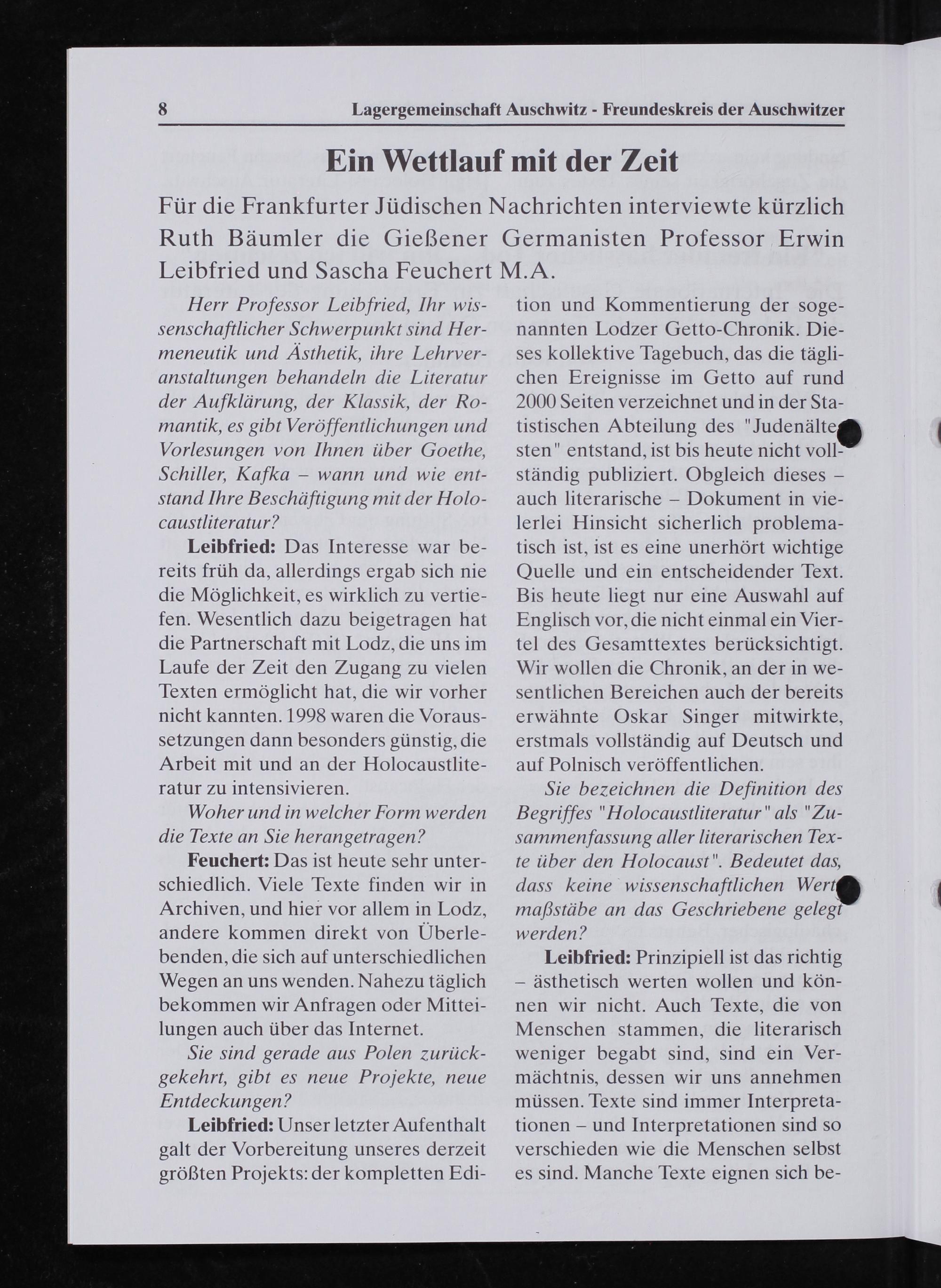 Leibfried: Das Interesse war be- reits früh da, allerdings ergab sich nie die Möglichkeit, es wirklich zu vertie- fen. Wesentlich dazu beigetragen hat die Partnerschaft mit Lodz, die uns im Laufe der Zeit den Zugang zu vielen Texten ermöglicht hat, die wir vorher nicht kannten. 1908 waren die Voraus- setzungen dann besonders günstig, die Arbeit mit und an der Holocaustlite- ratur zu intensivieren.