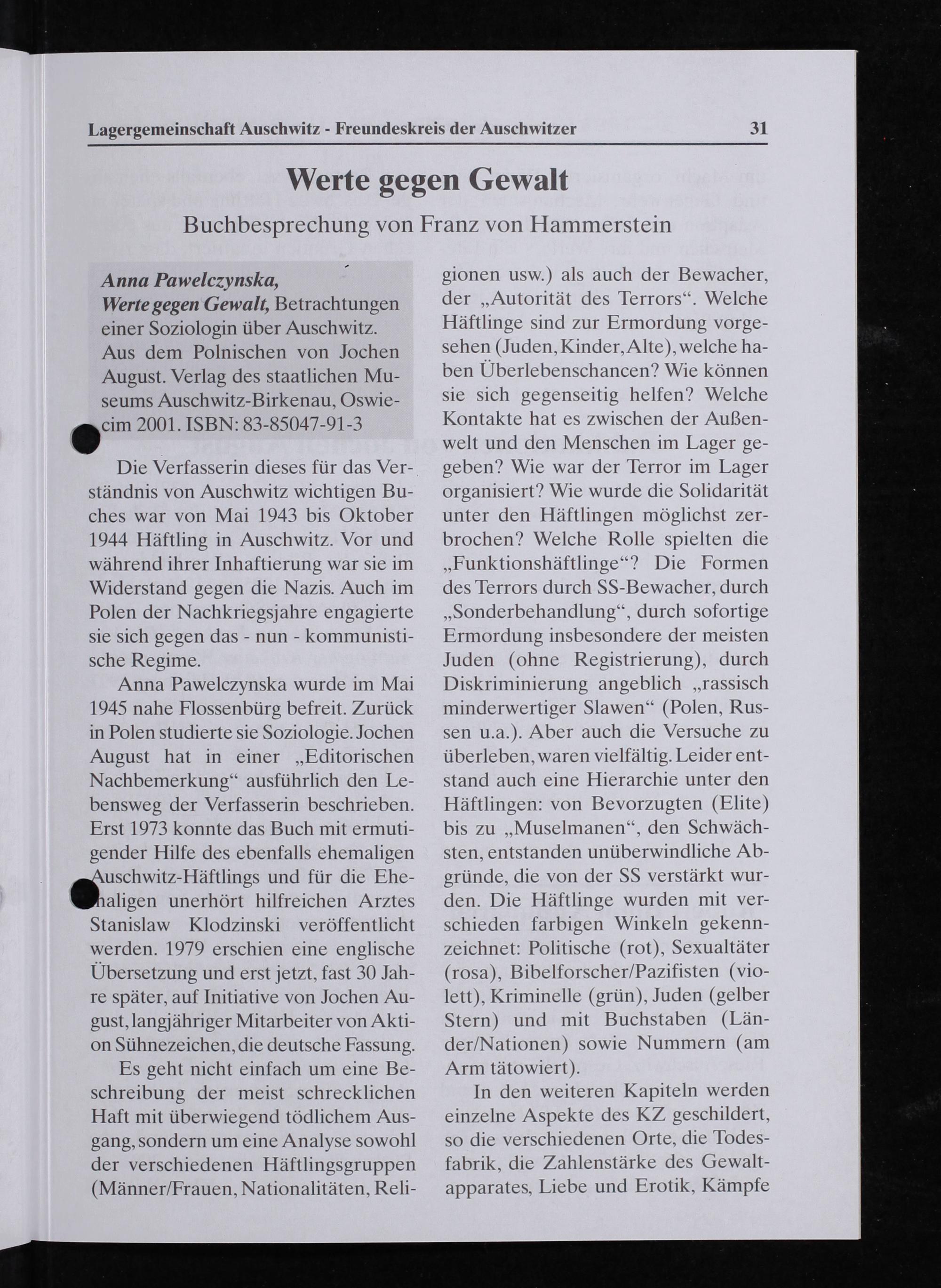 Anna Pawelczynska wurde im Mai 1945 nahe Flossenbürg befreit. Zurũck in Polen studierte sie Soziologie. Jochen August hat in einer„Fditorischen Nachbemerkung“ ausführlich den Le- bensweg der Verfasserin beschrieben. Erst 1973 konnte das Buch mit ermuti- gender Hilfe des ebenfalls ehemaligen