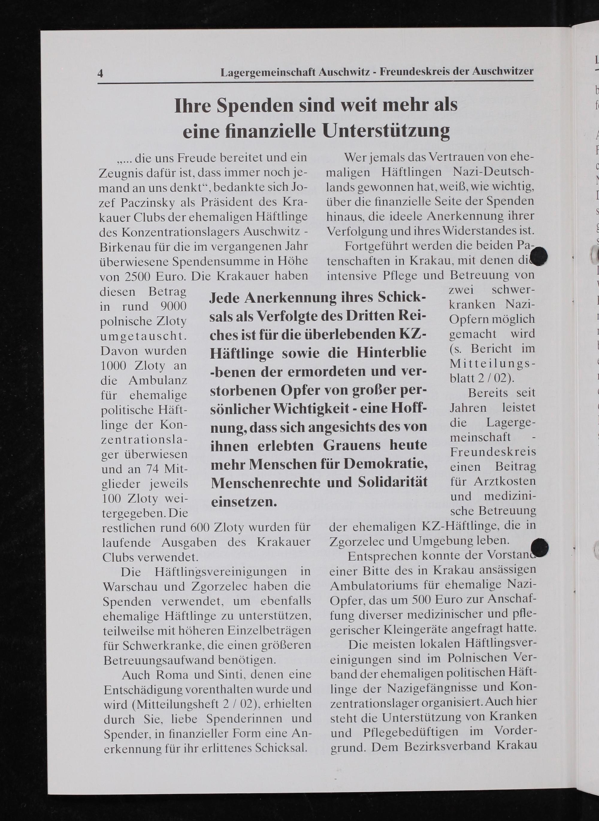 die uns Freude bereitet und ein Zeugnis dafür ist, dass immer noch je⸗ mand an uns denkt? bedankte sich Jo- zef Paczinsky als Präsident des Kra- kauer Clubs der ehemaligen Häftlinge des Konzentrationslagers Auschwitz- Birkenau für die im vergangenen Jahr überwiesene Spendensumme in Höhe von 2500 Euro. Die Krakauer haben diesen Betrag in rund 9000