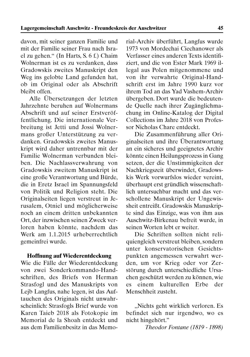 Die Zusammenführung aller Ori— ginalseiten und ihre Uberantwortung an ein sicheres und geeignetes Archiv könnte einen Heilungsprozess in Gang Setzen, der die Unstimmigkeiten der Nachkriegszeit überwindet, Gradows- kis Werk vorwurfslos wieder vereint, überhaupt erst gründlich wissenschaft- lich untersuchbar macht und das ver- schollene Manuskript der Ungewis- sheit entreißt. Gradowskis Manuskrip- te sind das Einzige, was von ihm aus Auschwitz-Birkenau befreit wurde, in seinen Worten lebt er weiter.