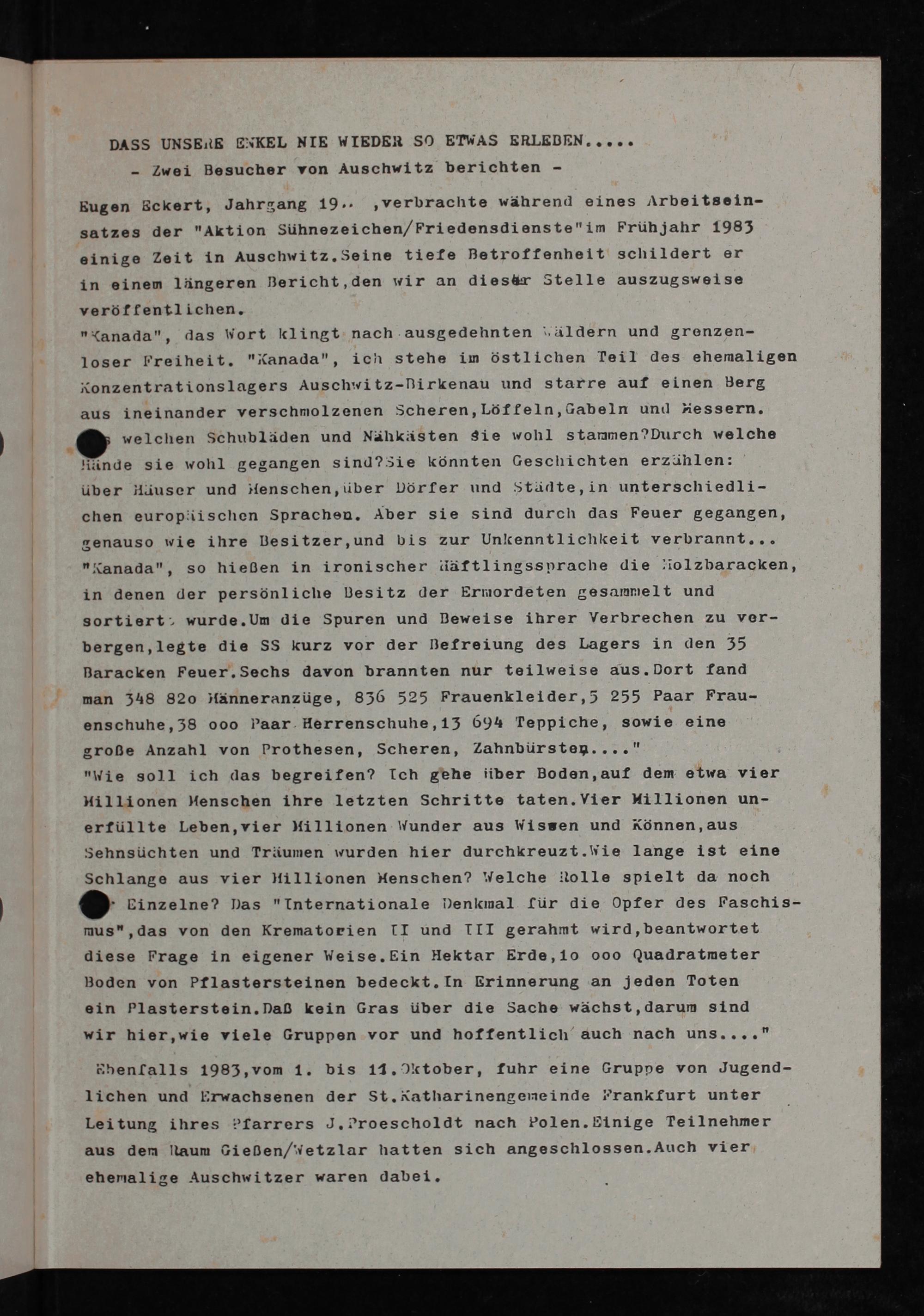 kugen Bckert, Jahrgang 19„verbrachte vährend eines Arbeitsetn- satzes der Aktion Sühnezeichen/Friedensdienstenim Frühjahr 1983 einige Zeit in Auschwitz. Seine tiefe Betroffenhett schiLdert er in einem 1ängeren Bericht, den vir an dtessr Stelle auszugsveise veröffentlichen. nKanada“, das Vort Klüngt nach ausgedehnten väldern und grenzen- 1oser Freiheit.»Kanada“, ich stehe im östlichen Tei1 des ehemaligen Konzentrationslagers Auschwitz-Rirkenau und starre auf einen Berg aus inelnander verschmolzenen scheren, Löffeln, Gabeln und ſiessern. welchen Schub1Läden und Nähkästen sie wohl stanmen?Durch welche Hnde sie vohl gegangen sind?sie könnten Geschichten erzählen: über Häuser und iHenschen, über Pörfer und städte, in unterschied1i- chen europiitschen Sprachen. Aber sie sind durch das Feuer gegangen, genauso vie ihre Besitzer, und bis zur Unkenntlichkeit verbrannt⸗. nKanada“, so hießen in tronischer iäftlingssprache die io1zbaracken, in denen der persönliche Besitz der Ermordeten gesammelt und sortiert vurde. Um die Spuren und Bewetse ihrer Verbrechen zu ver- bergen, 1egte die S8 kurz vor der Befreiung des Lagers in den 35 Baracken Feuer. Sechs davon brannten nur teilveise aus. Dort fand man Ju8 820 janneranzüge, 836 525 Frauenkleider, 5 255 Paar Frau- enschuhe, 38 ooo0 Paar Herrenschuhe, 13 69% Teppiche, sov1e eine große Anzahl von Prothesen, Scheren, Zahnbürsten.„ Wie so11 ich das begreifen? Ich gehe iiber Boden, auf dem etwa vier Mi111 onen Menschen ihre 1etzten Schritte taten. Vier Mi11ionen un- errül1Lte Leben, vier Mi111onen Wunder aus Wissen und Können, aus Sehnsüchten und Träumen wurden hier durchkreuzt.Vie 1 ange ist eine Schlange aus vier Mi11ionen Menschen? Nelche o11e spielt da noch D Einze1lne? Das»Unternationale Denkmal Tür die Opfer des Faschis- mus“, das von den Krematorien LT und TIT gerahmt vird, beantwortet diese Frage in eigener Meise. Ein Hektar Erde, 10 o00 Quadratmeter Boden von Prlastersteinen bedeckt. In Erinnerung an Jeden Toten ein Plasterstein. Daß kein Gras über dte Sache wächst, darum s1nd