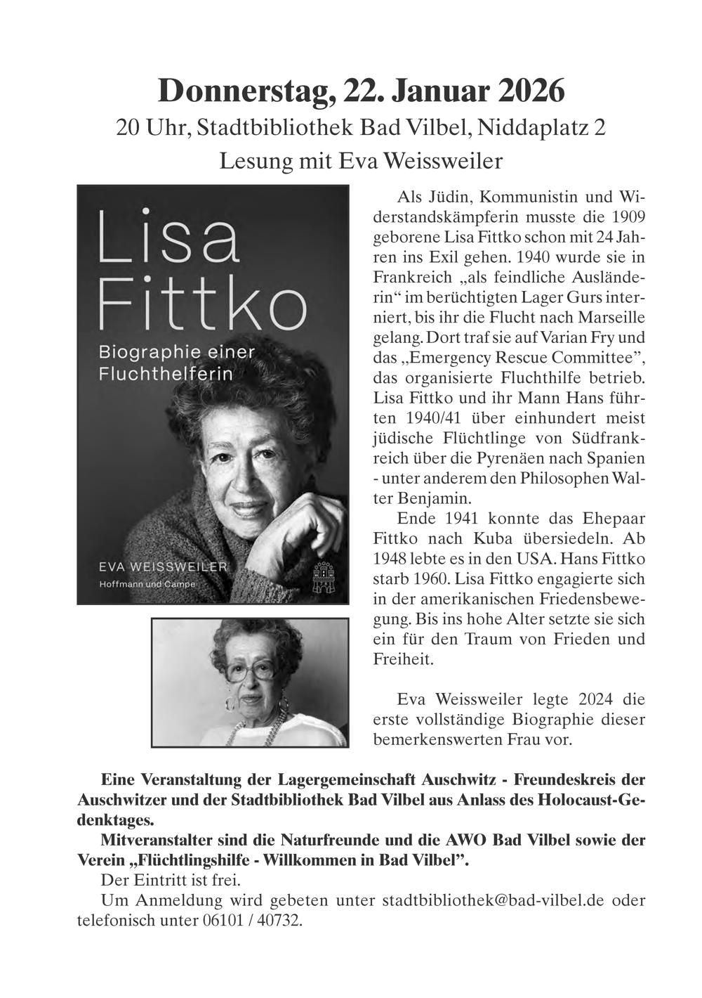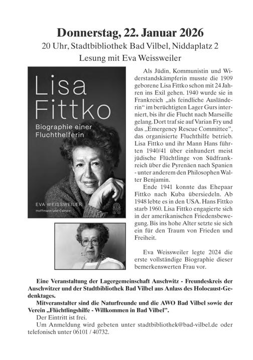 Eine Veranstaltung der Lagergemeinschaft Auschwitz- Freundeskreis der Auschwitzer und der Stadtbibliothek Bad Vilbel aus Anlass des Holocaust-Ge-
