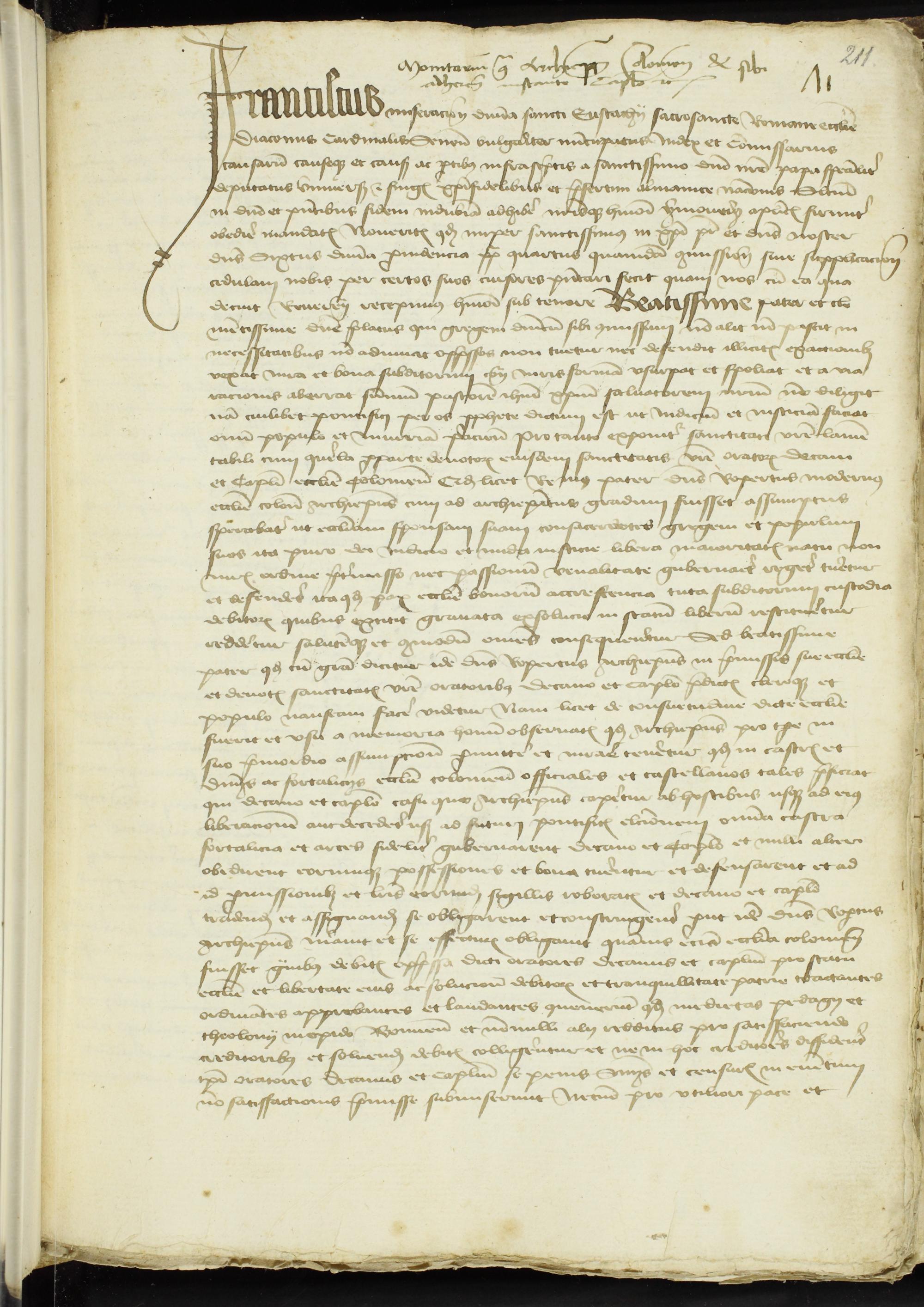 211r-217r Mahnschreiben des Kardinaldiakons Franz tit. S. Eustachii Senensis vulgariter nuncupatus an den Erzbischof Rupert von Köln (20. Mai 1472)