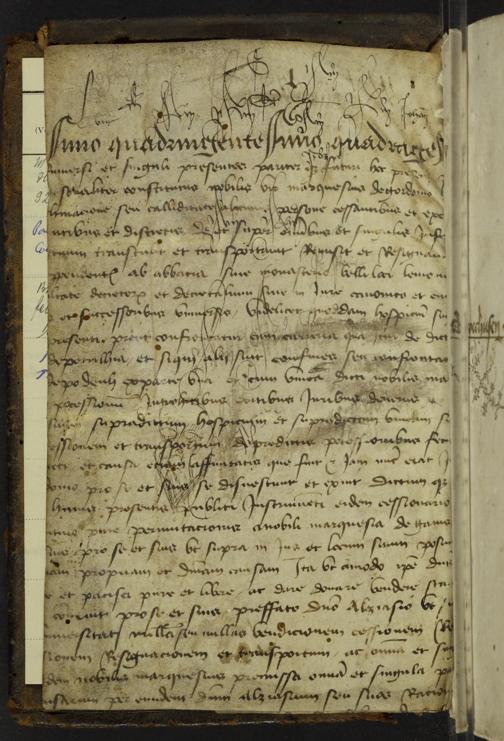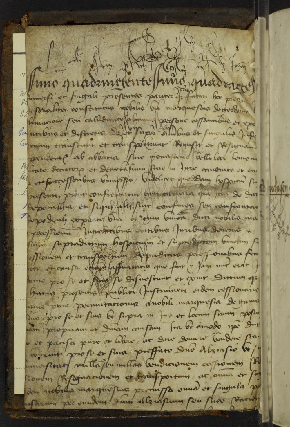 1r-1v Vorsatz, abgelöster Spiegel (Pergament, Urkundenfragment)