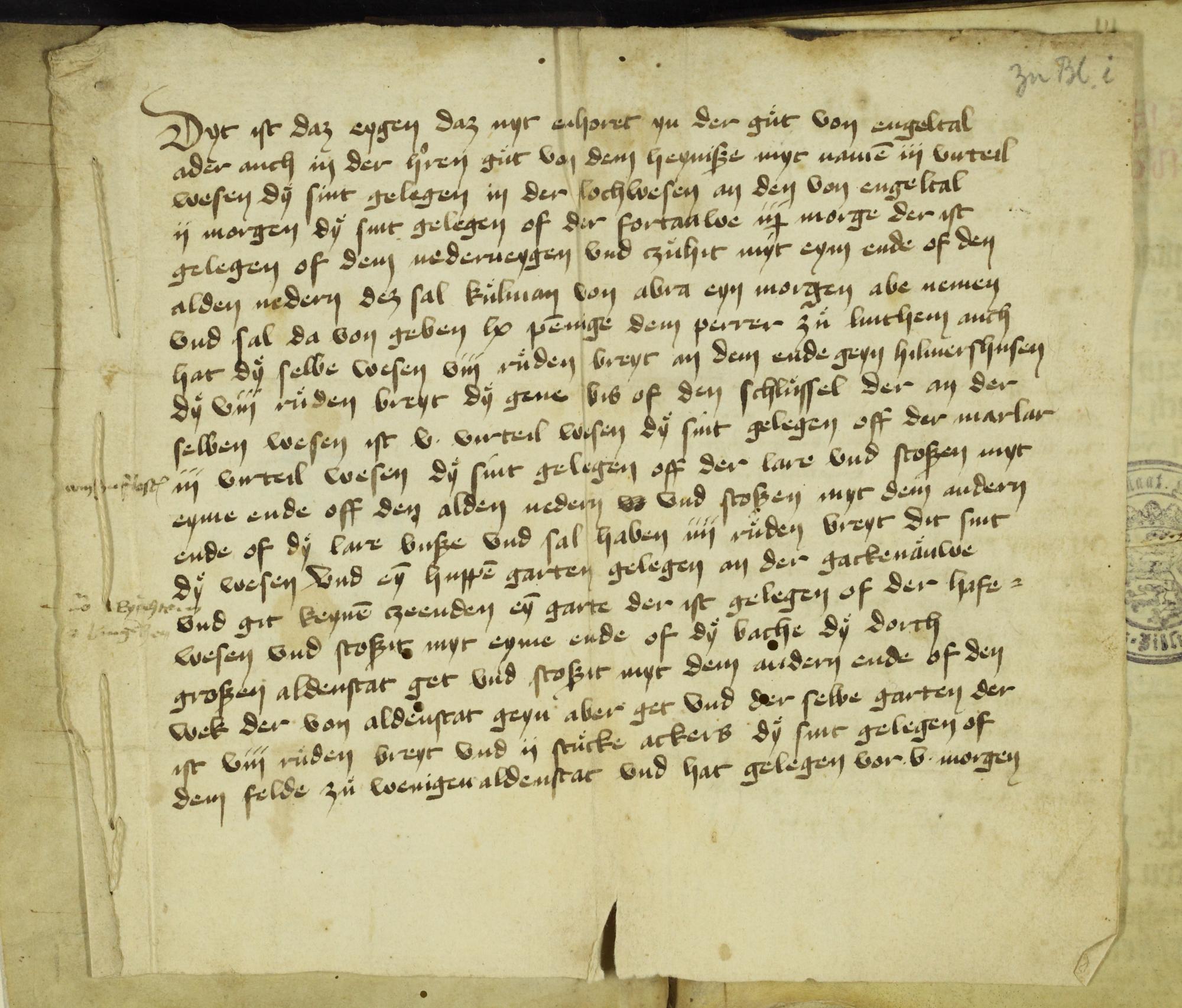 zu i r angenähte Beilage: Aufzählung von Wiesen, die nicht zum Gut des Klosteres Engelthal zählen, sondern zinsfrei sind.