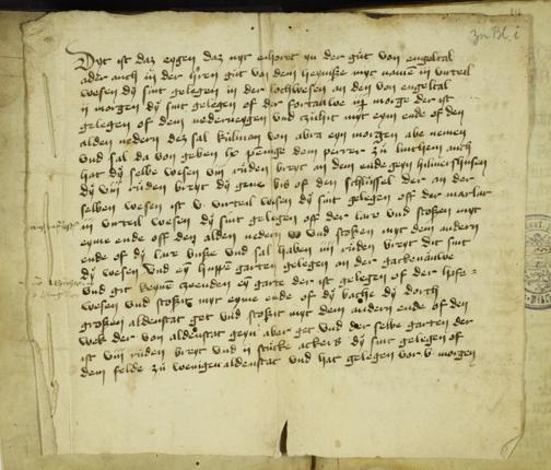 zu i v angenähte Beilage: Übergabeprotokoll (Wagen Hartmann übergibt im Beisein von Veltin von Büches acht Pferde, einen Wagen, zwei Pflüge, zwei Kühe im Wert von 73 Mark an den neuen Hofmann des Klosters, Hartmann Philipsen)