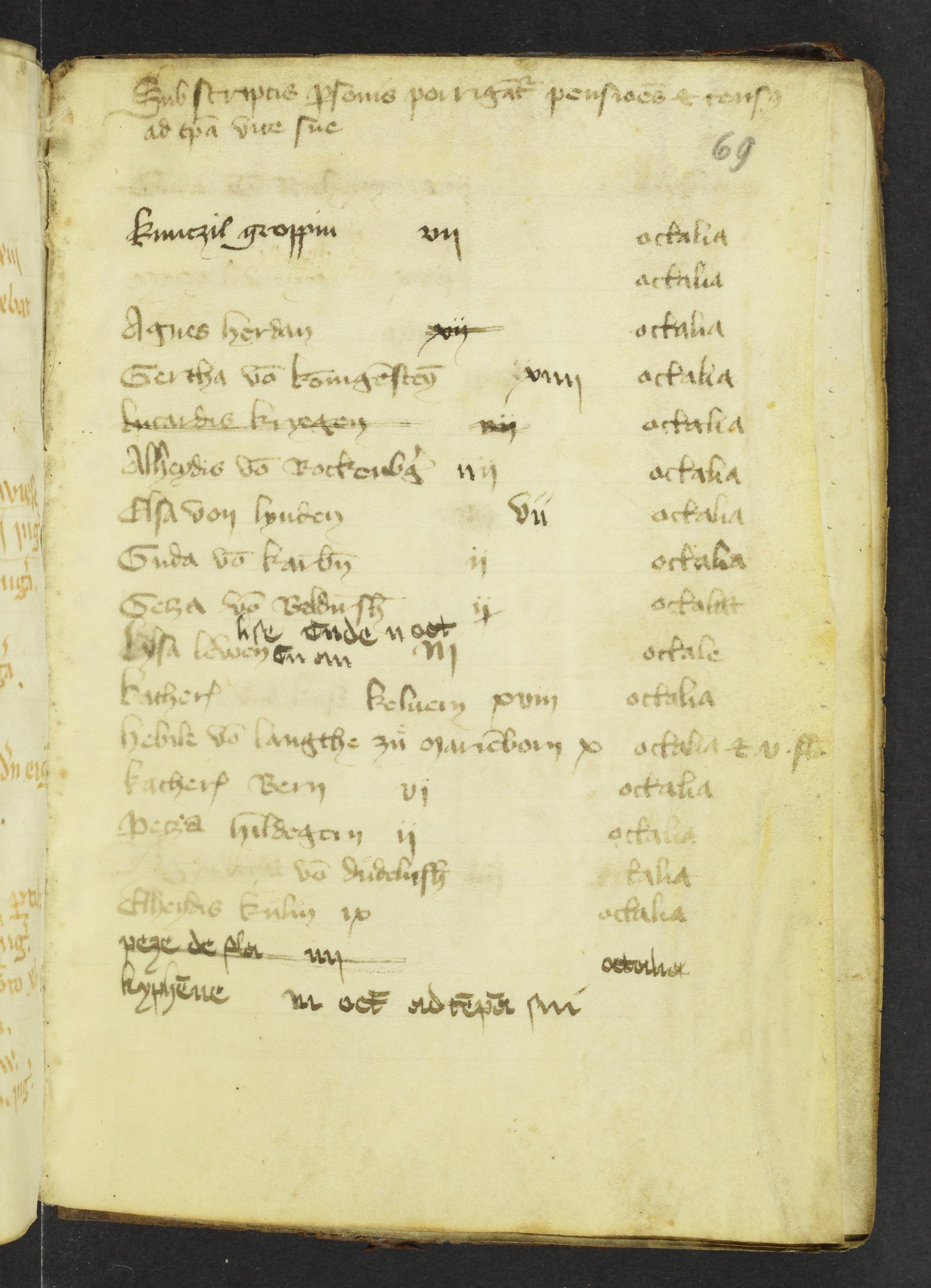 69v Namen der ersten Liste ausradiert und gestrichen, dafür auf den Folgeseiten von späterer Hand neu aufgeschrieben