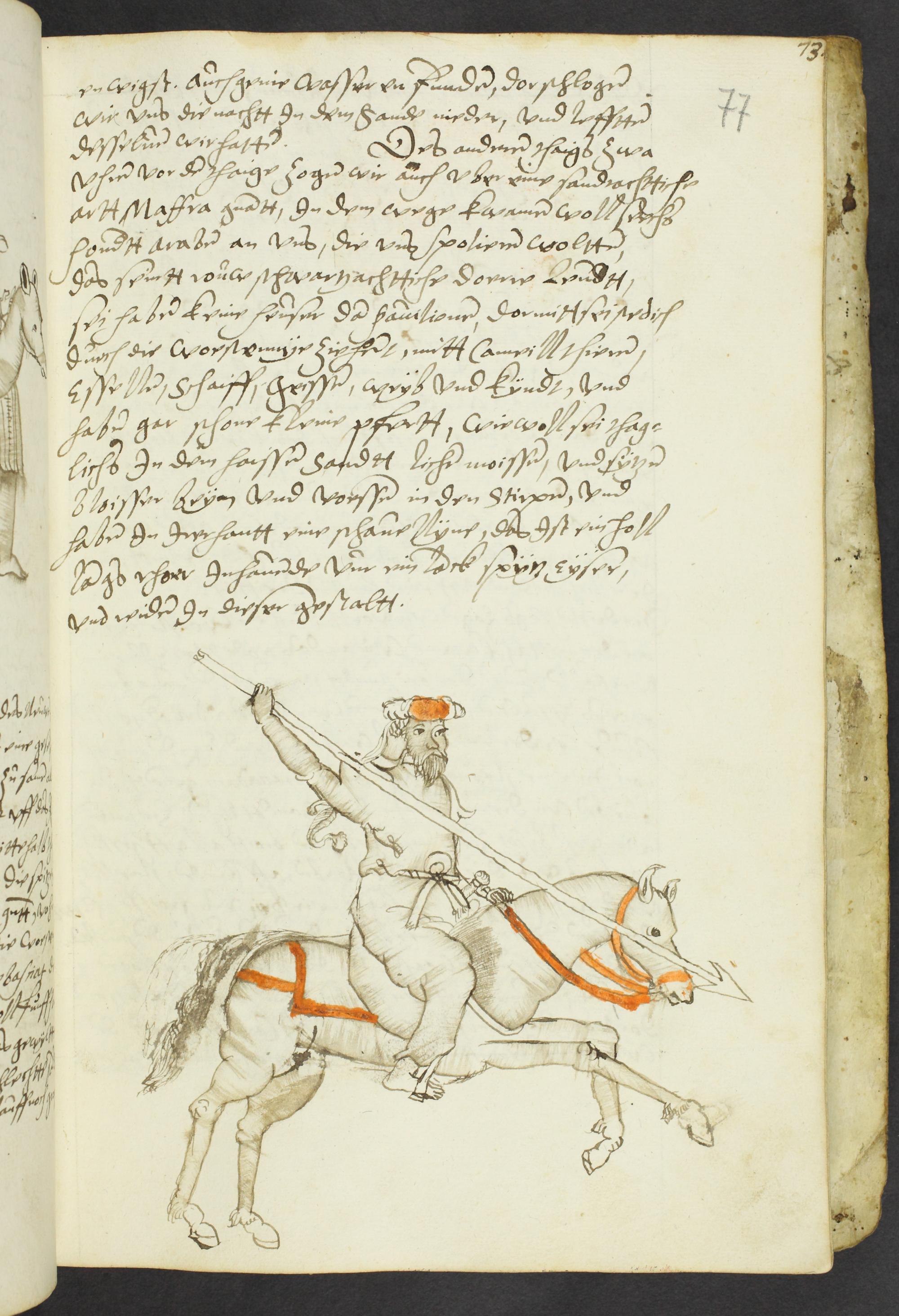 77r Illustration: Arabischer Krieger mit Lanze auf einem Pferd